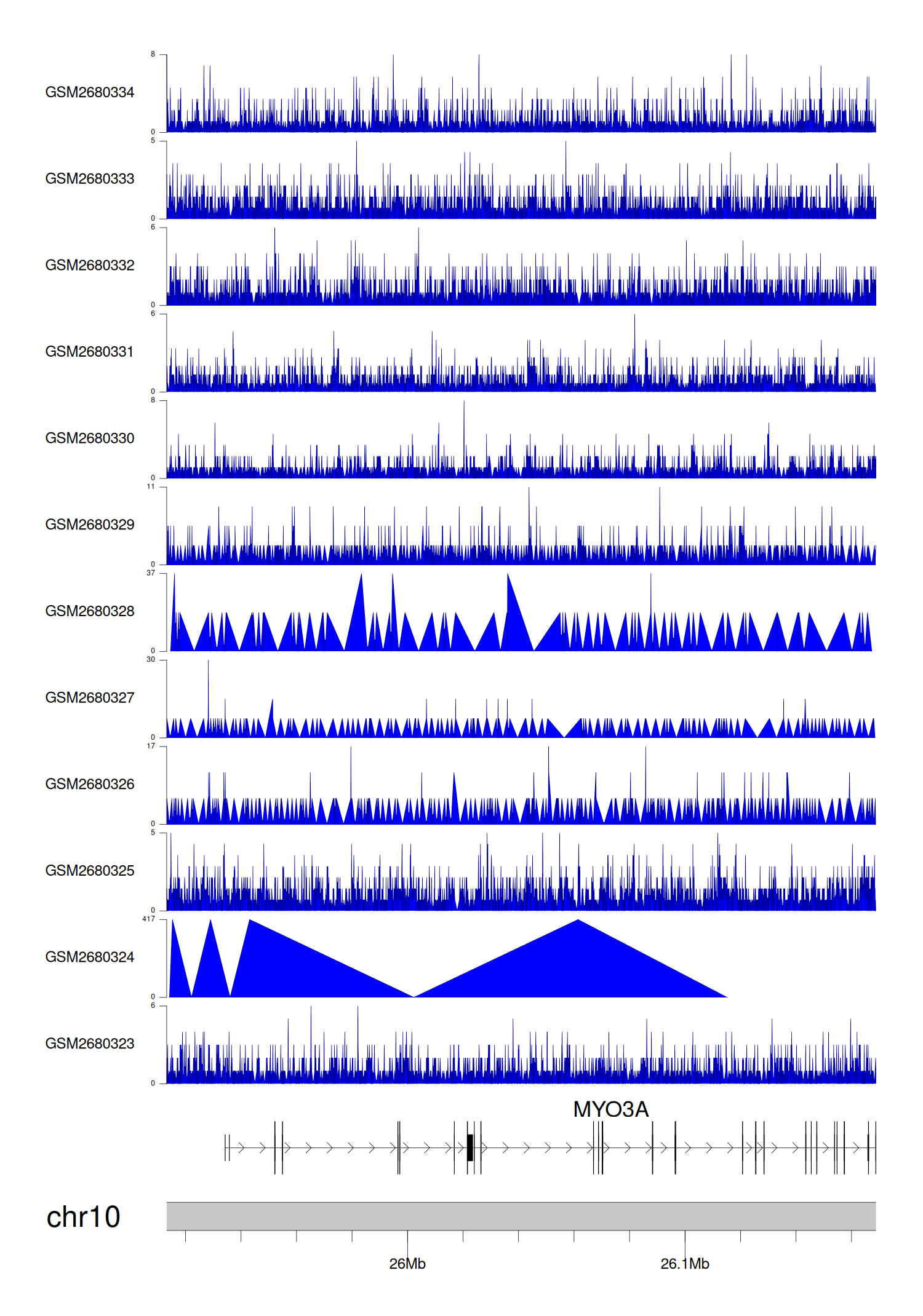 The protein encoded by this gene belongs to the myosin superfamily. Myosins are actin-dependent motor proteins and are categorized into conventional myosins (class II) and unconventional myosins (classes I and III through XV) based on their variable C-terminal cargo-binding domains. Class III myosins, such as this one, have a kinase domain N-terminal to the conserved N-terminal motor domains and are expressed in photoreceptors. The protein encoded by this gene plays an important role in hearing in humans. Three different recessive, loss of function mutations in the encoded protein have been shown to cause nonsyndromic progressive hearing loss. Expression of this gene is highly restricted, with the strongest expression in retina and cochlea. [provided by RefSeq, Jul 2008] |