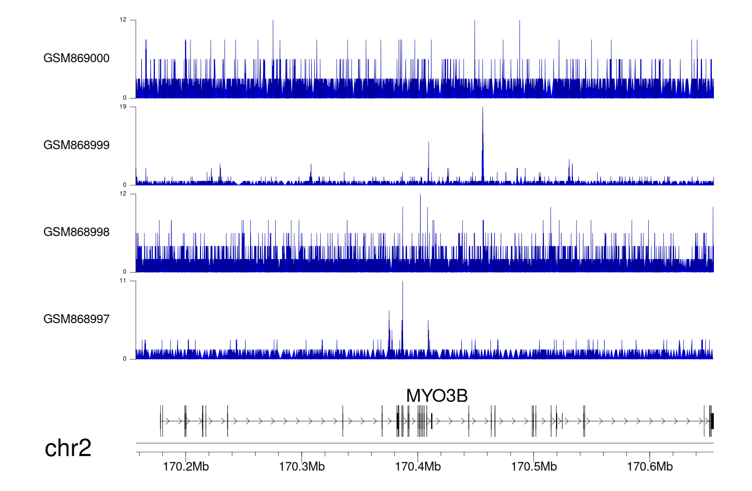 > Dataset: GSE68402 - MYO3B peak across samples