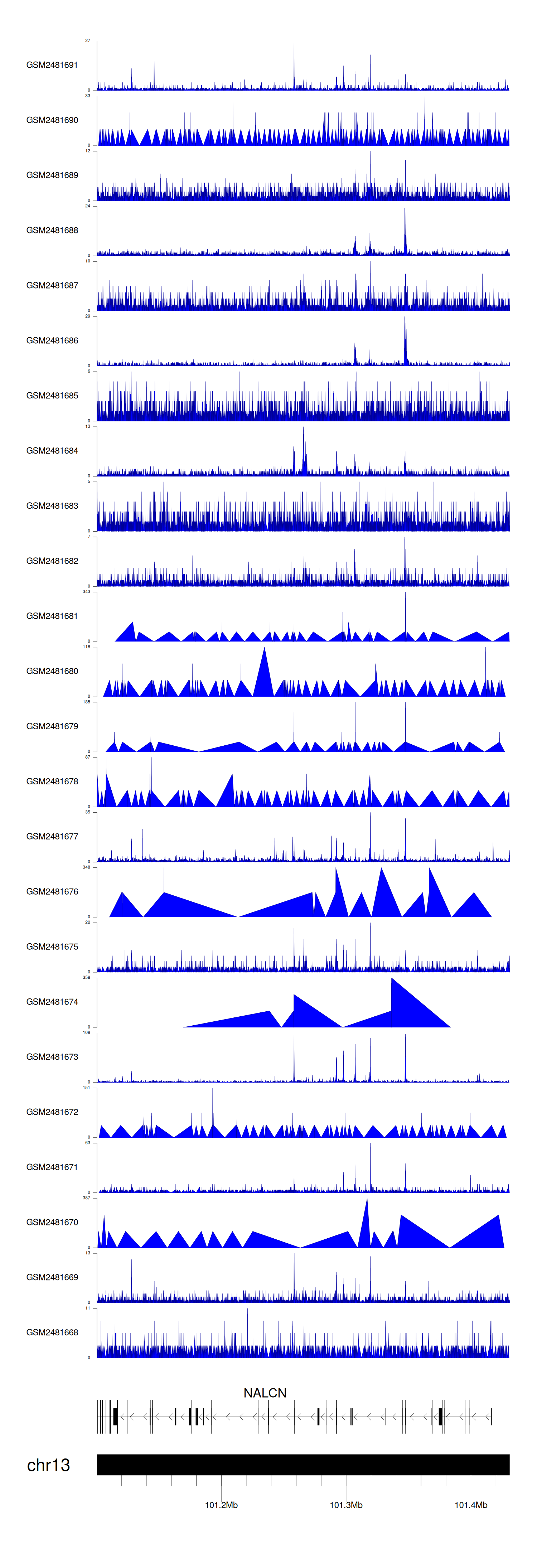 This gene encodes a voltage-independent, nonselective cation channel which belongs to a family of voltage-gated sodium and calcium channels that regulates the resting membrane potential and excitability of neurons. This family is expressed throughout the nervous system and conducts a persistent sodium leak current that contributes to tonic neuronal excitability. The encoded protein forms a channelosome complex that includes G-protein-coupled receptors, UNC-79, UNC-80, NCA localization factor-1, and src family tyrosine kinases. Naturally occurring mutations in this gene are associated with infantile neuroaxonal dystrophy, infantile hypotonia with psychomotor retardation and characteristic facies (IHPRF) syndrome, and congenital contractures of the limbs and face with hypotonia and developmental delay (CLIFAHDD) syndrome. A knockout of the orthologous gene in mice results in paralysis with a severely disrupted respiratory rhythm, and lethality within 24 hours after birth. [provided by RefSeq, Apr 2017] |