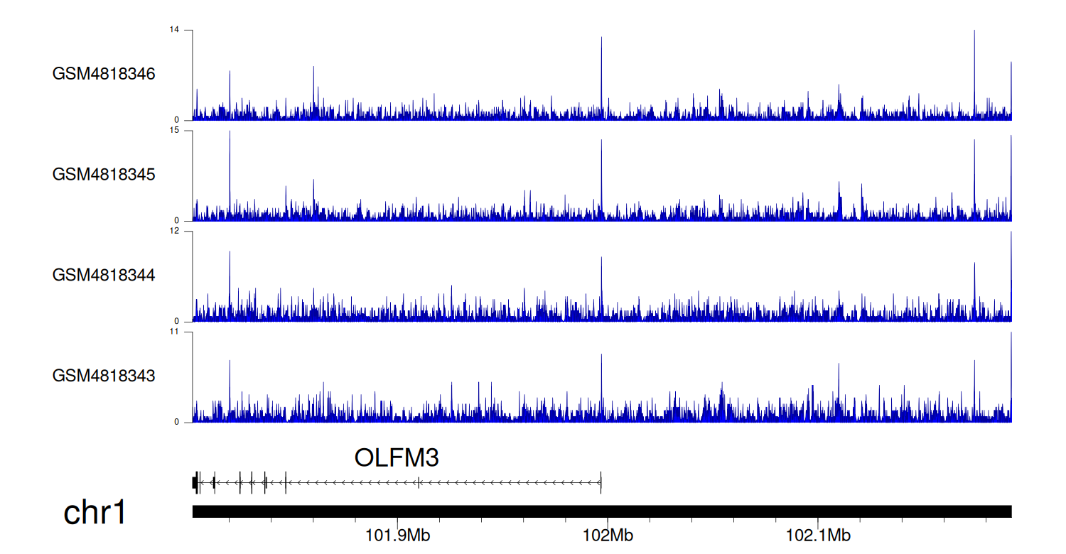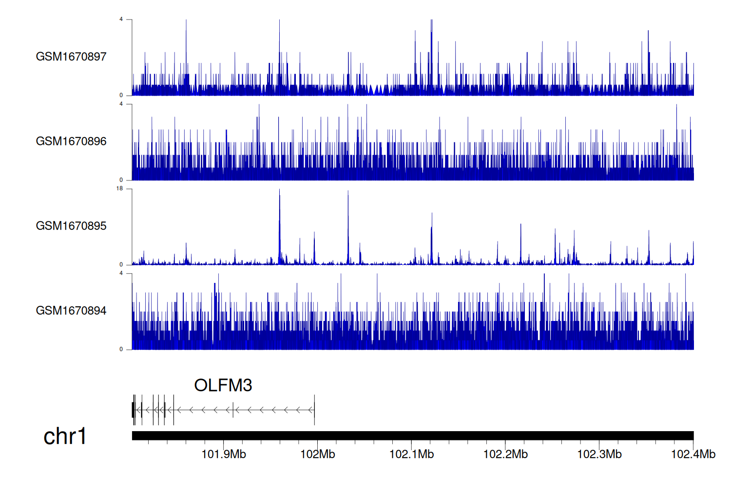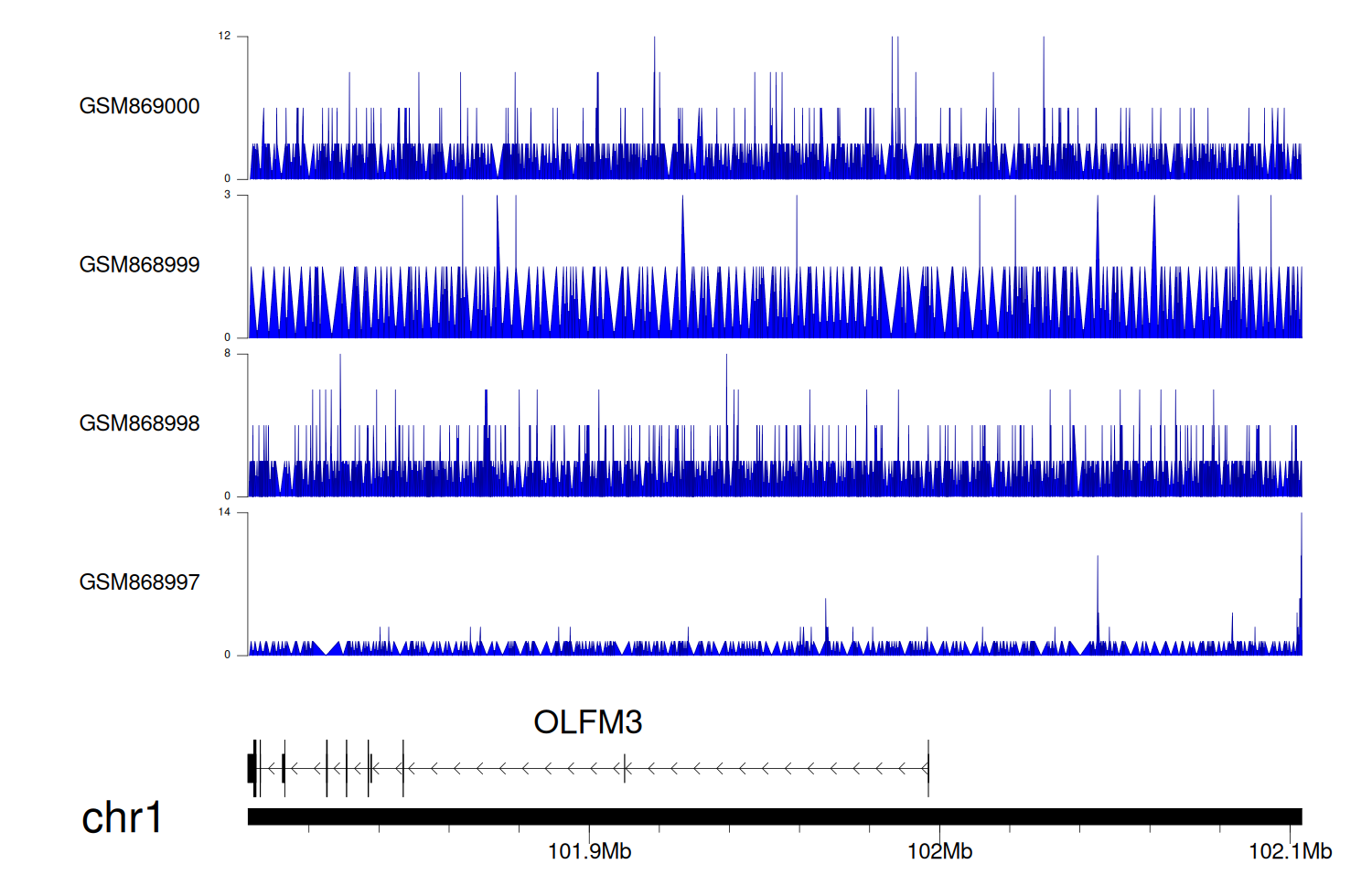 > Dataset: GSE68402 - OLFM3 peak across samples