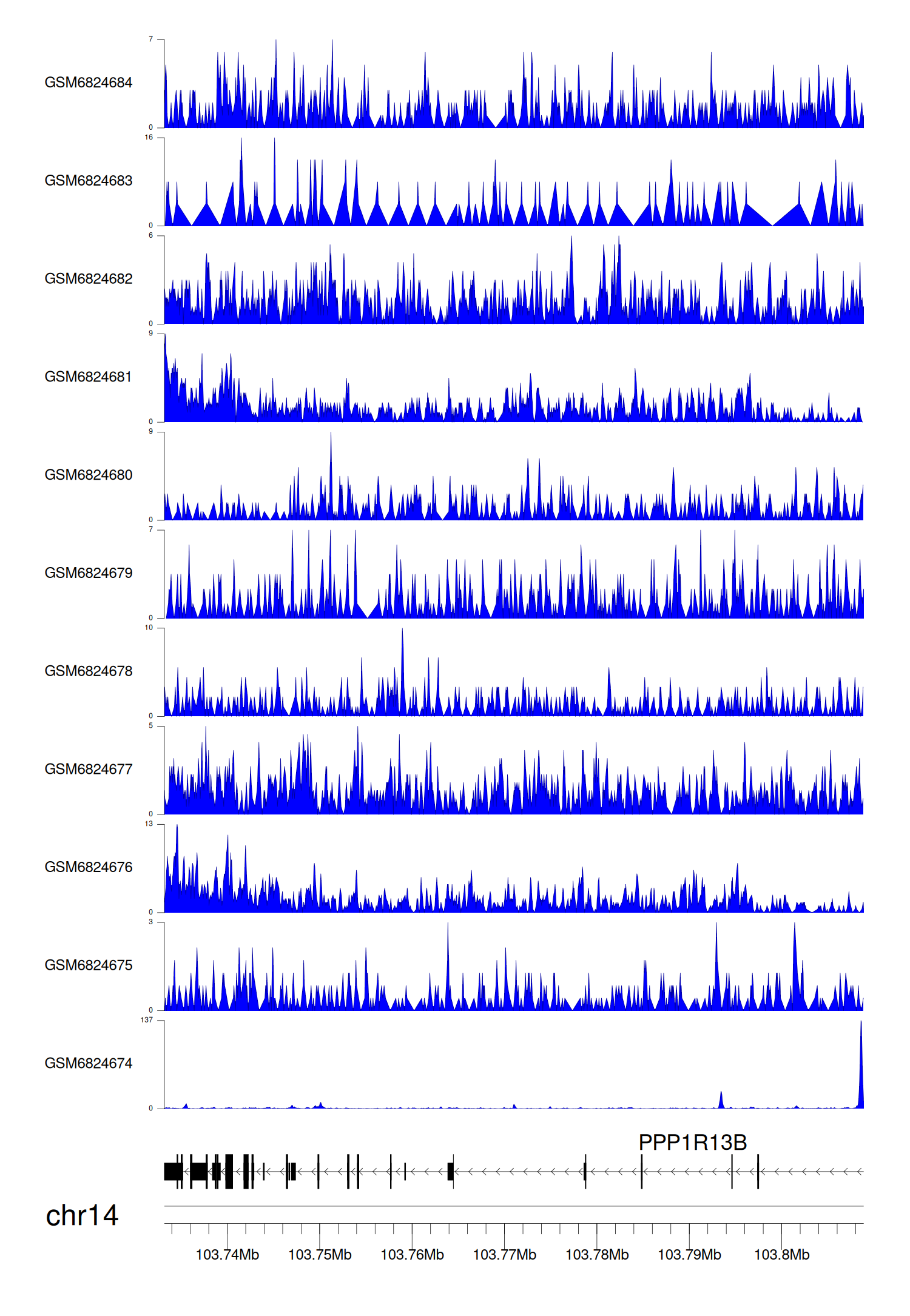 > Dataset: GSE144329 - PPP1R13B peak across samples