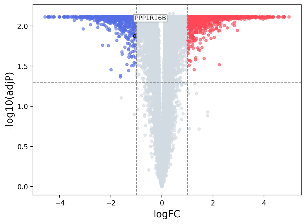 When the query gene is differentially changed in the dataset, a volcano/bar plot will be displayed.