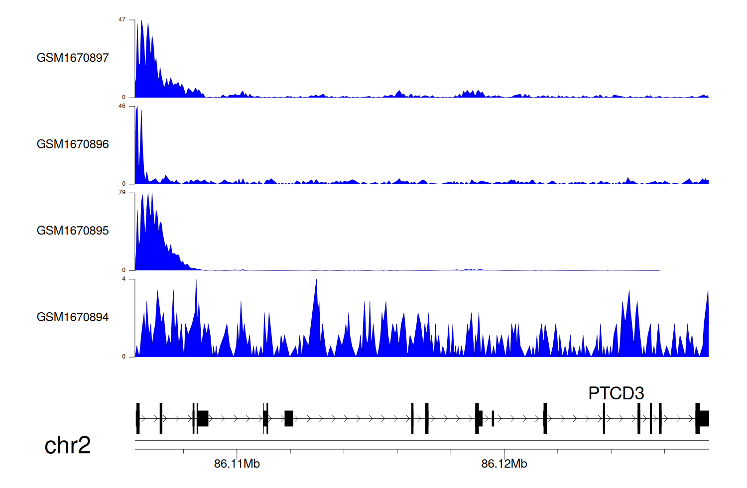 > Dataset: GSE35465 - PTCD3 peak across samples