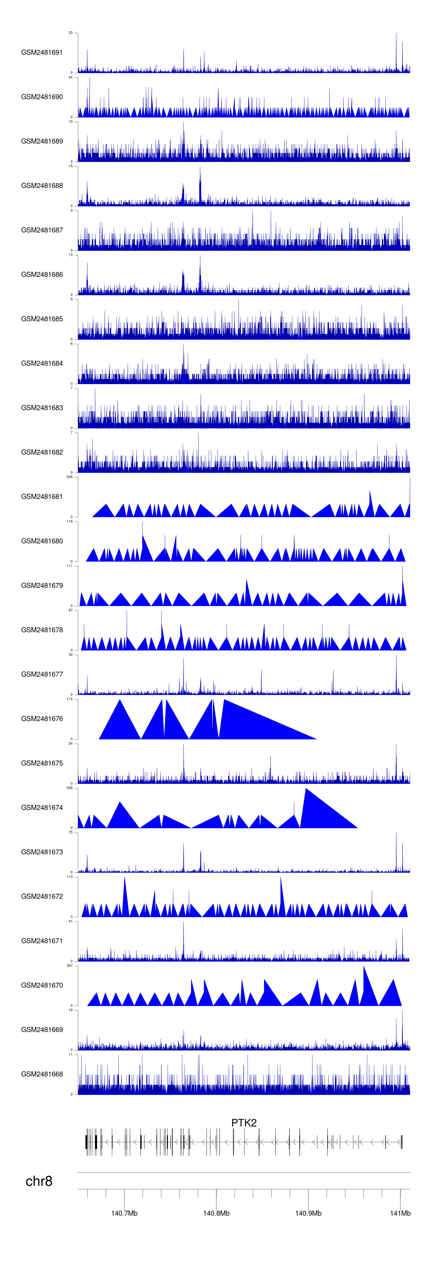 This gene encodes a cytoplasmic protein tyrosine kinase which is found concentrated in the focal adhesions that form between cells growing in the presence of extracellular matrix constituents. The encoded protein is a member of the FAK subfamily of protein tyrosine kinases but lacks significant sequence similarity to kinases from other subfamilies. Activation of this gene may be an important early step in cell growth and intracellular signal transduction pathways triggered in response to certain neural peptides or to cell interactions with the extracellular matrix. Several transcript variants encoding different isoforms have been found for this gene. [provided by RefSeq, Jun 2017] |