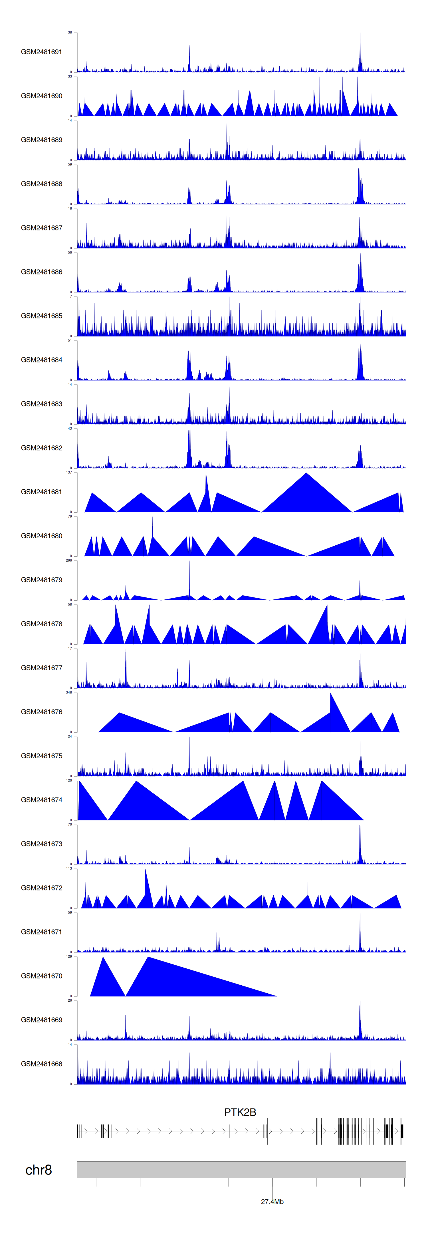 This gene encodes a cytoplasmic protein tyrosine kinase which is involved in calcium-induced regulation of ion channels and activation of the map kinase signaling pathway. The encoded protein may represent an important signaling intermediate between neuropeptide-activated receptors or neurotransmitters that increase calcium flux and the downstream signals that regulate neuronal activity. The encoded protein undergoes rapid tyrosine phosphorylation and activation in response to increases in the intracellular calcium concentration, nicotinic acetylcholine receptor activation, membrane depolarization, or protein kinase C activation. This protein has been shown to bind CRK-associated substrate, nephrocystin, GTPase regulator associated with FAK, and the SH2 domain of GRB2. The encoded protein is a member of the FAK subfamily of protein tyrosine kinases but lacks significant sequence similarity to kinases from other subfamilies. Four transcript variants encoding two different isoforms have been found for this gene. [provided by RefSeq, Jul 2008] |