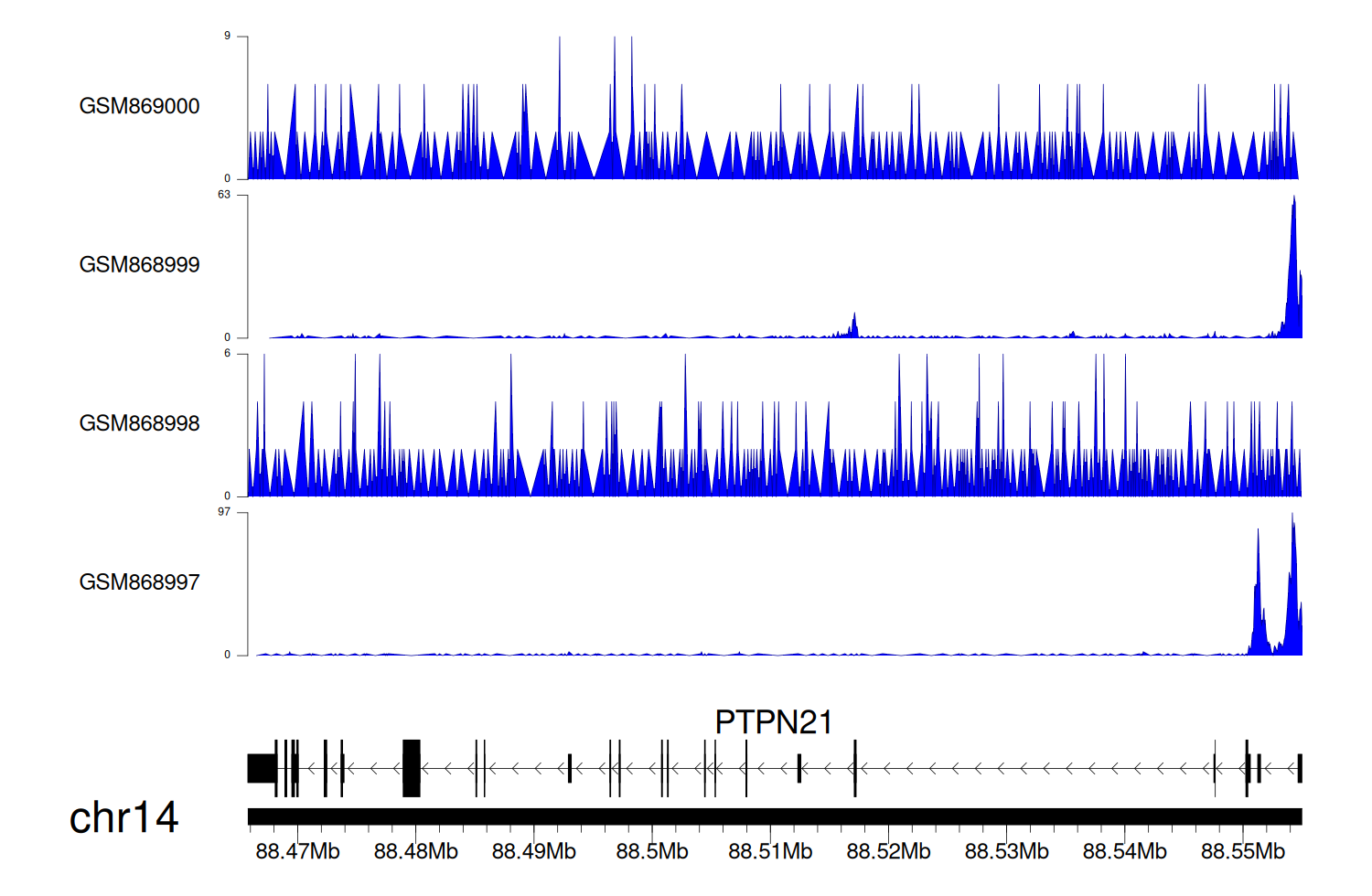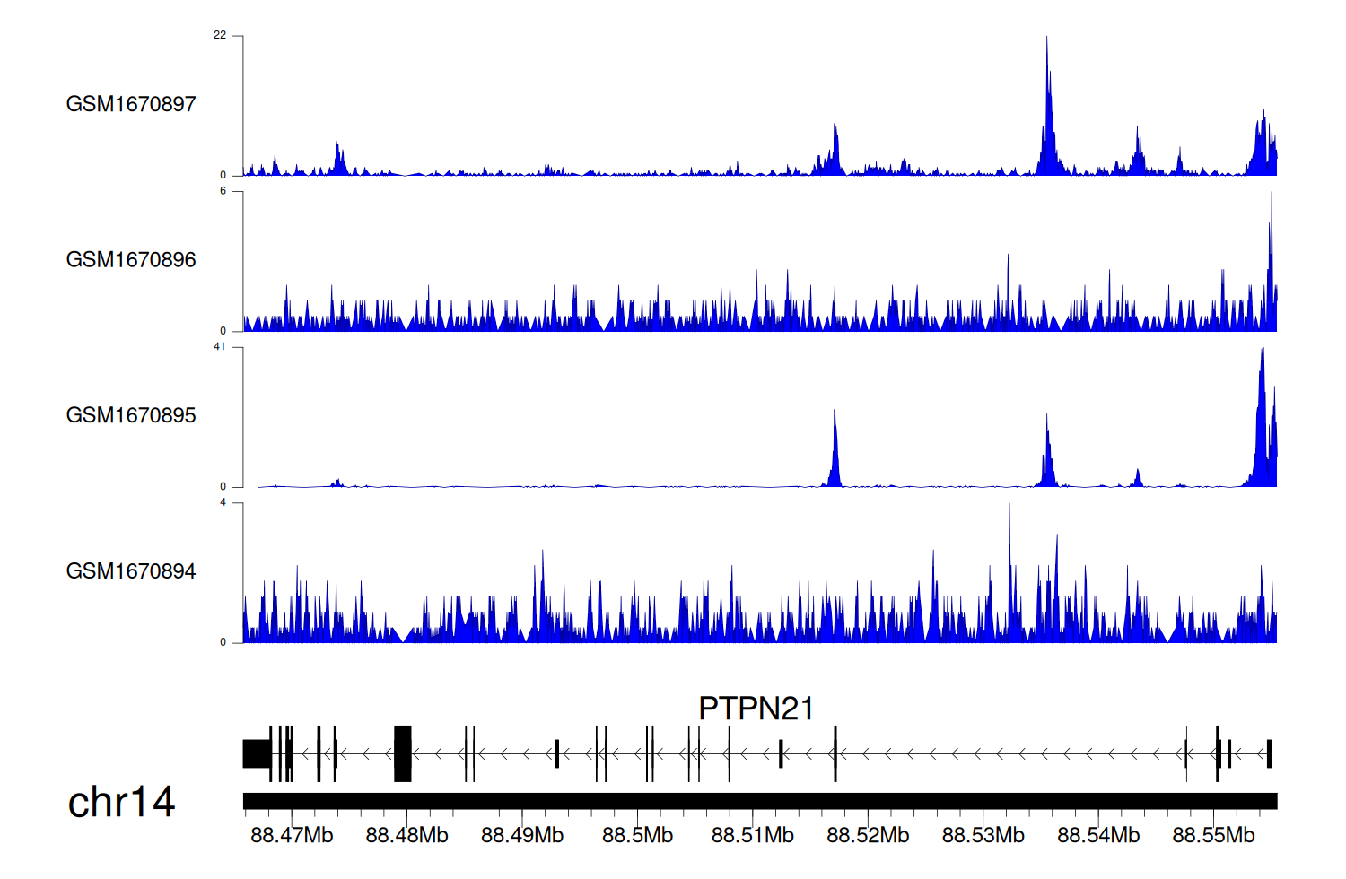 > Dataset: GSE68402 - PTPN21 peak across samples