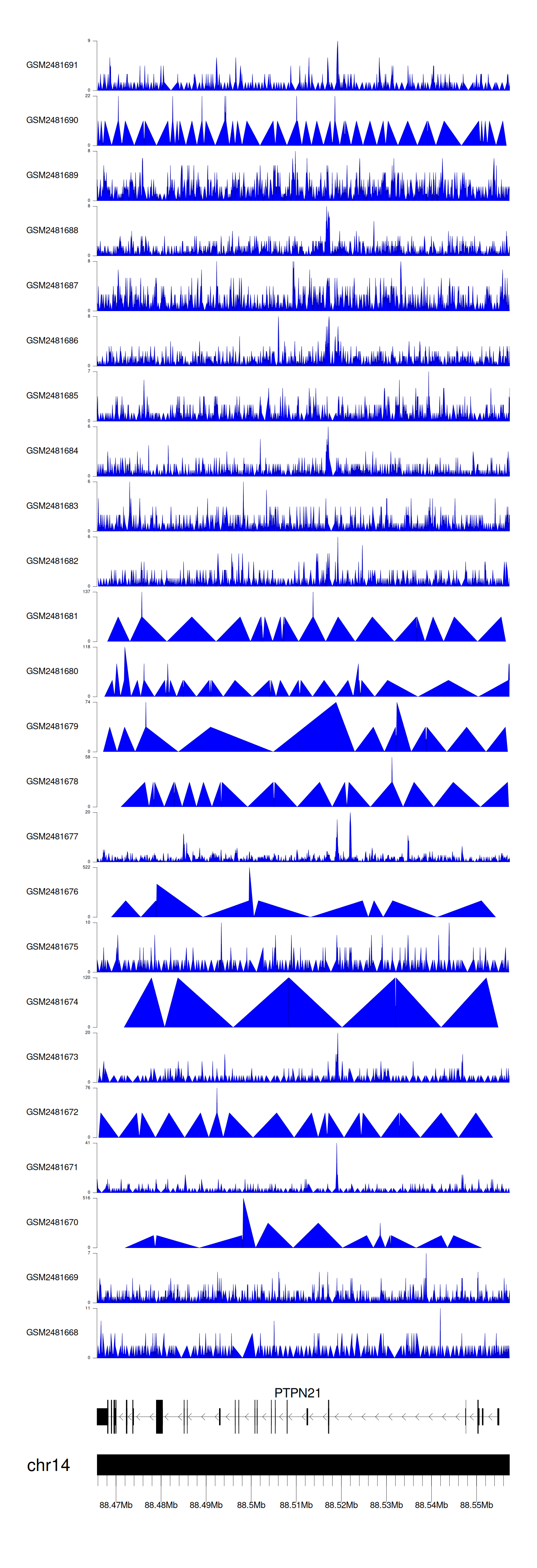 > Dataset: GSE94732 - PTPN21 peak across samples