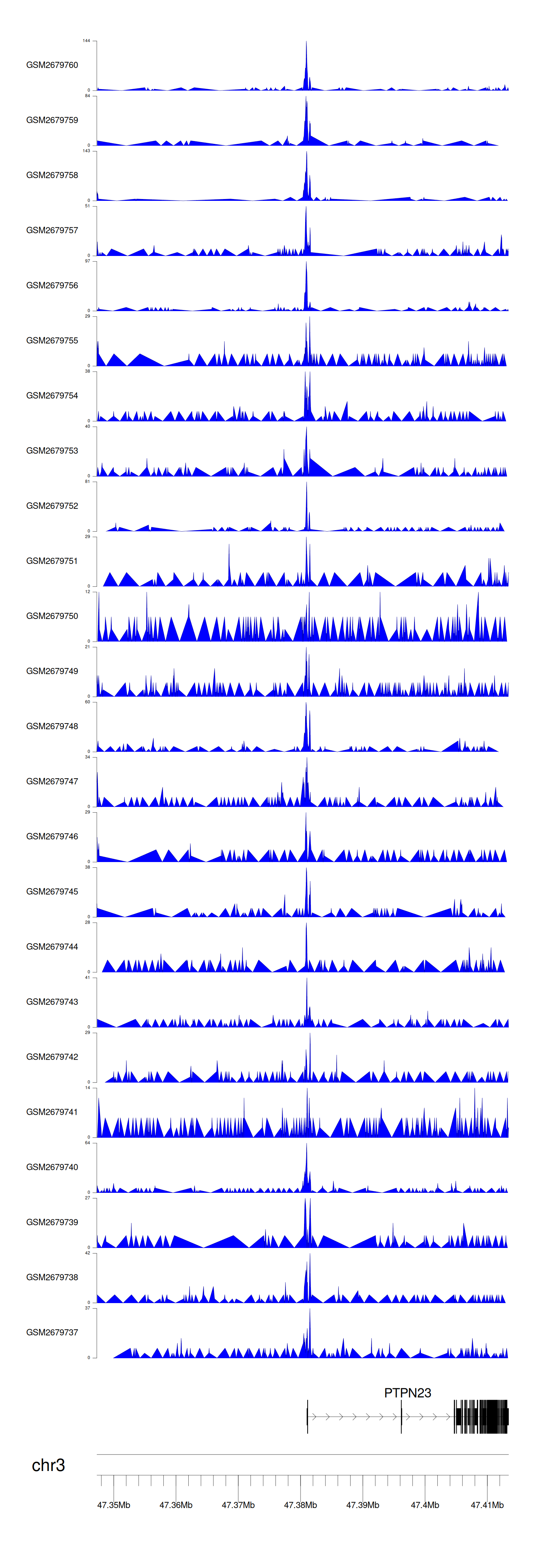 > Dataset: GSE144329 - PTPN23 peak across samples