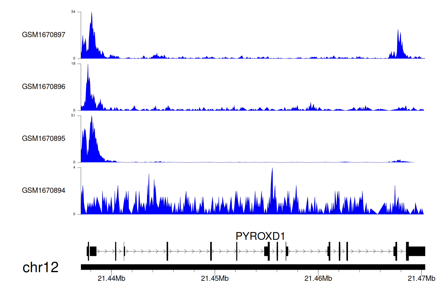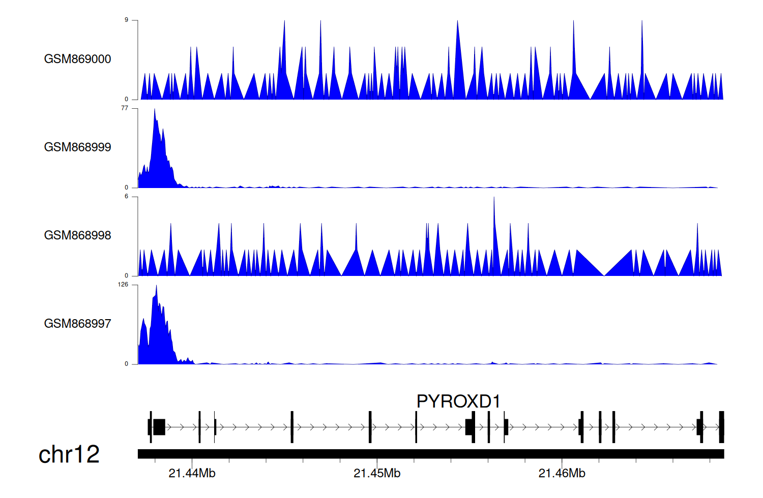 > Dataset: GSE68402 - PYROXD1 peak across samples