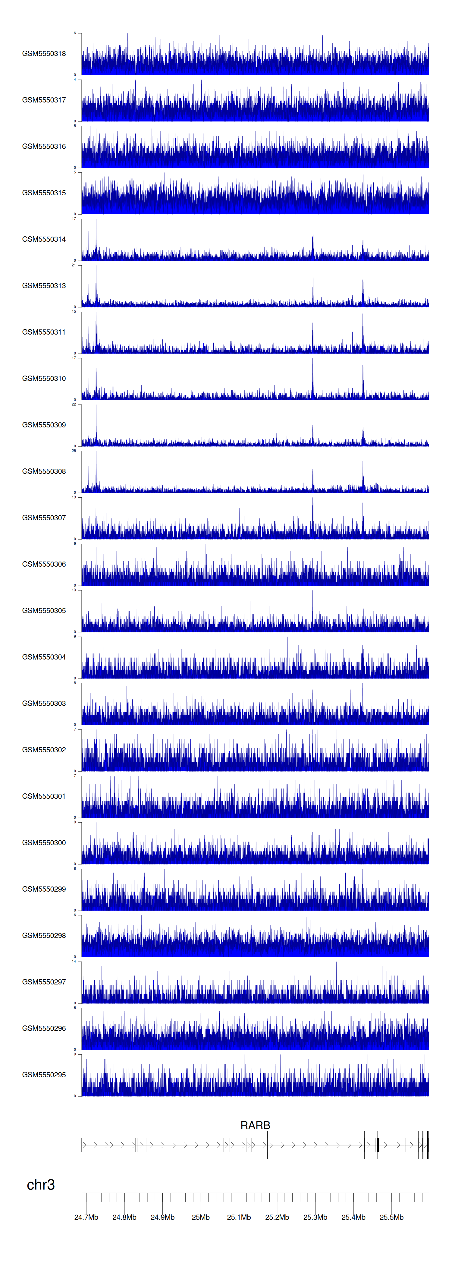 Summary This gene encodes retinoic acid receptor beta, a member of the thyroid-steroid hormone receptor superfamily of nuclear transcriptional regulators. This receptor localizes to the cytoplasm and to subnuclear compartments. It binds retinoic acid, the biologically active form of vitamin A which mediates cellular signalling in embryonic morphogenesis, cell growth and differentiation. It is thought that this protein limits growth of many cell types by regulating gene expression. The gene was first identified in a hepatocellular carcinoma where it flanks a hepatitis B virus integration site. Alternate promoter usage and differential splicing result in multiple transcript variants. [provided by RefSeq, Mar 2014]