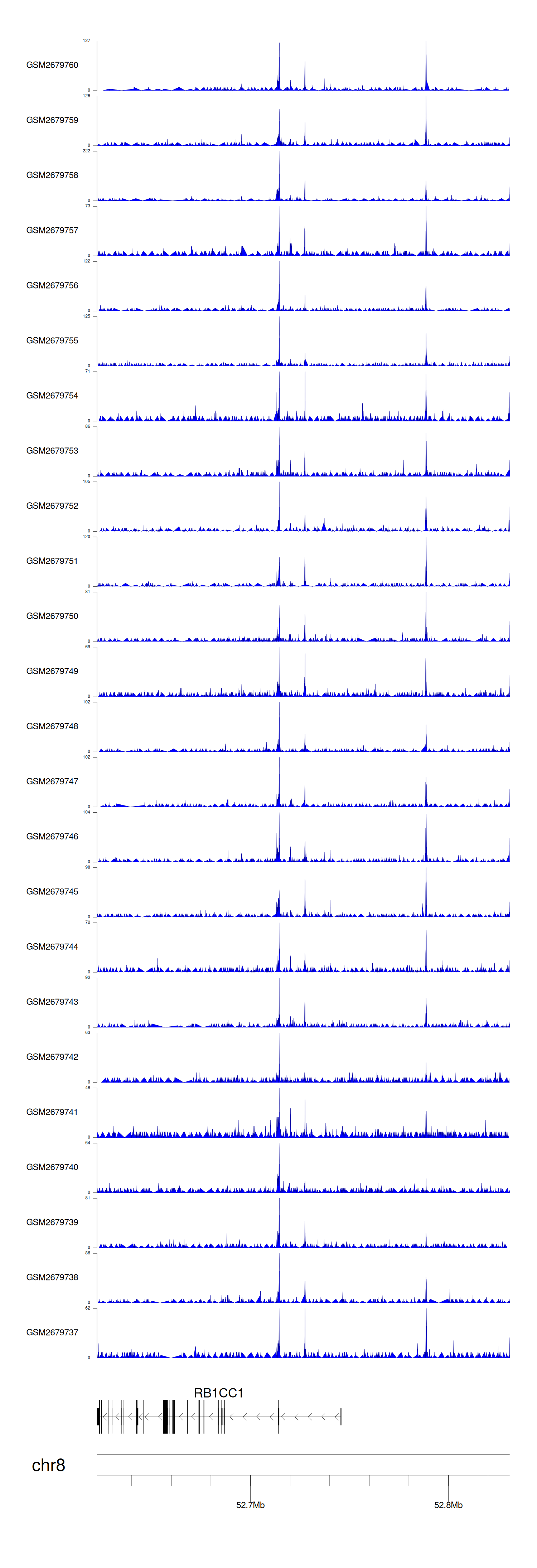 > Dataset: GSE30738 - RB1CC1 peak across samples
