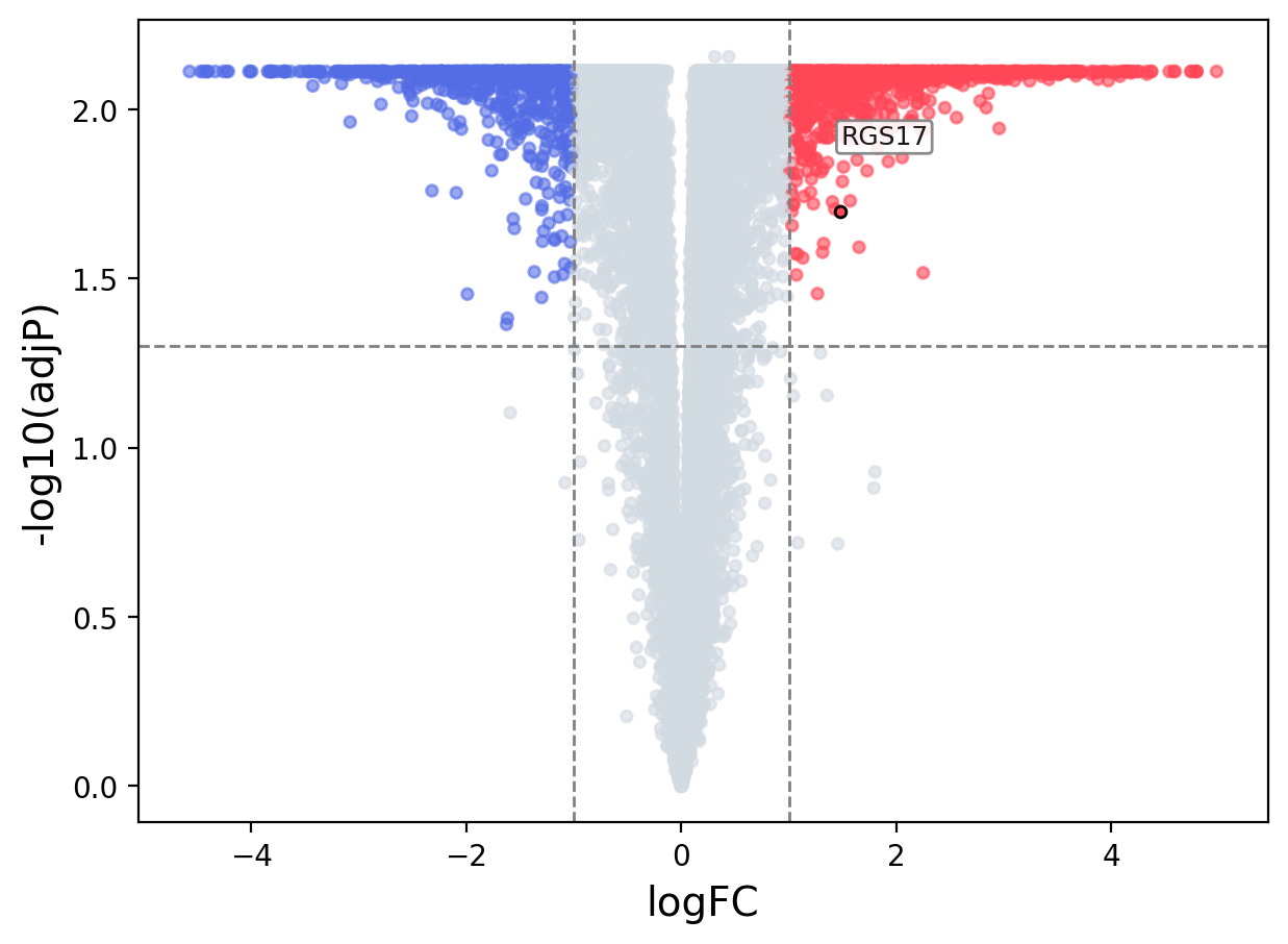 When the query gene is differentially changed in the dataset, a volcano/bar plot will be displayed.