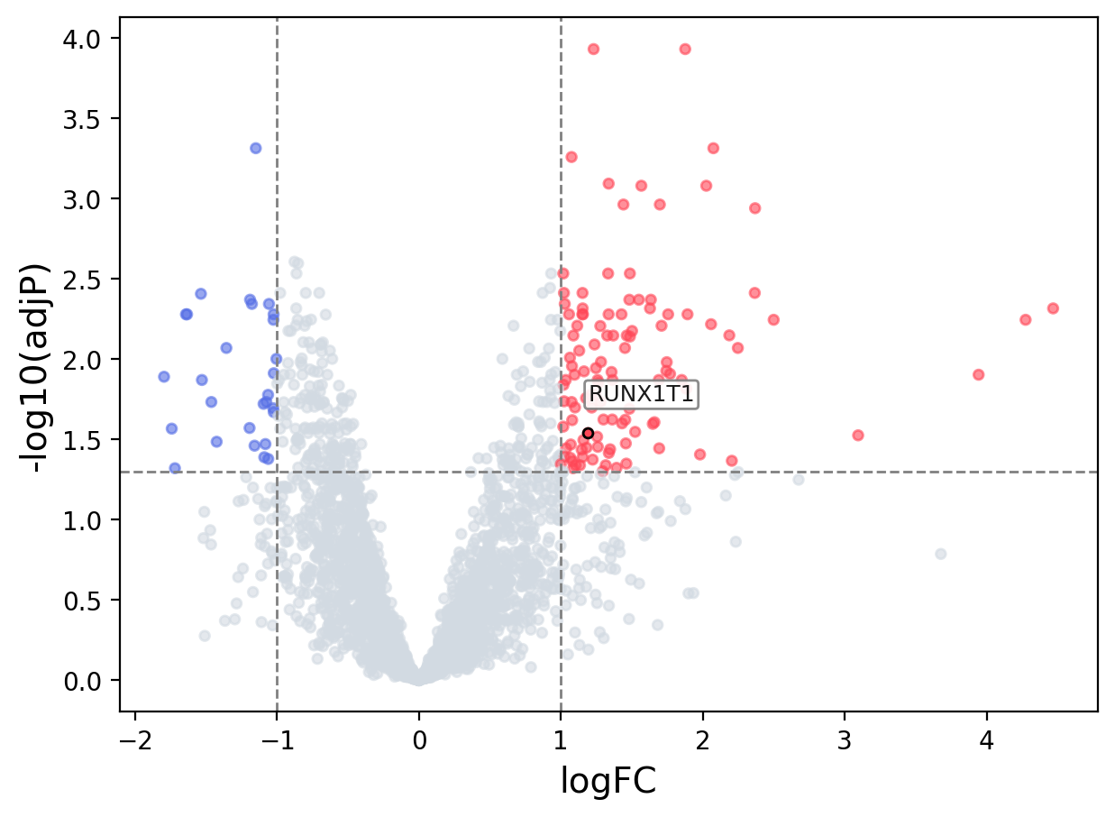 When the query gene is differentially changed in the dataset, a volcano/bar plot will be displayed.