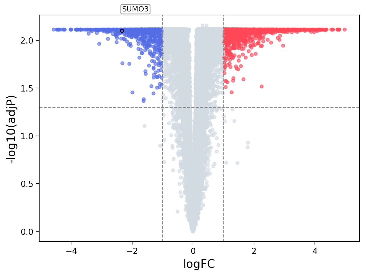 When the query gene is differentially changed in the dataset, a volcano/bar plot will be displayed.