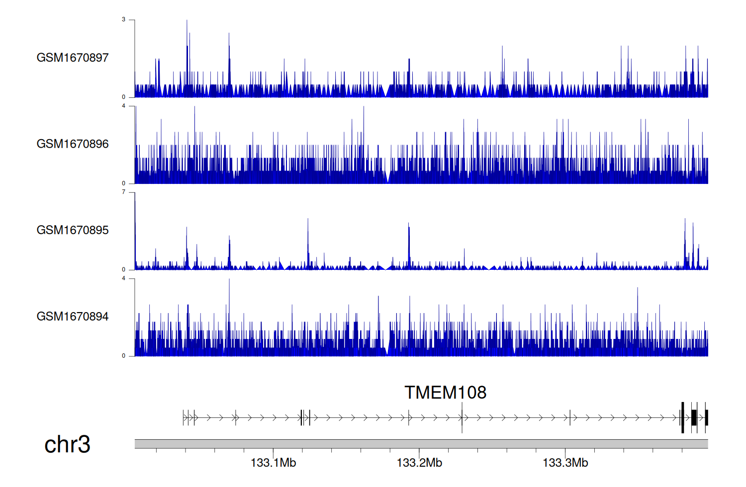 > Dataset: GSE100400 - TMEM108 peak across samples