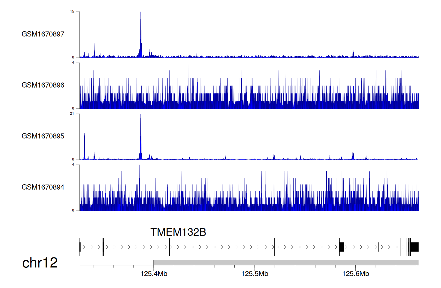 > Dataset: GSE64877 - TMEM132B peak across samples