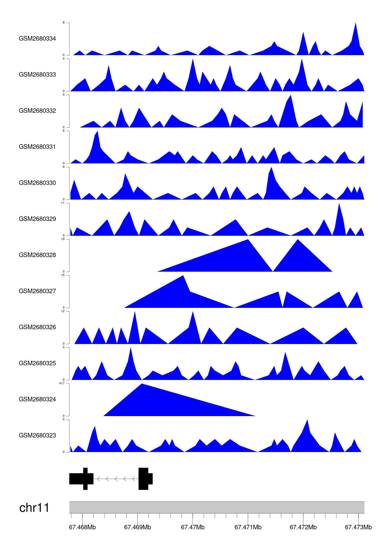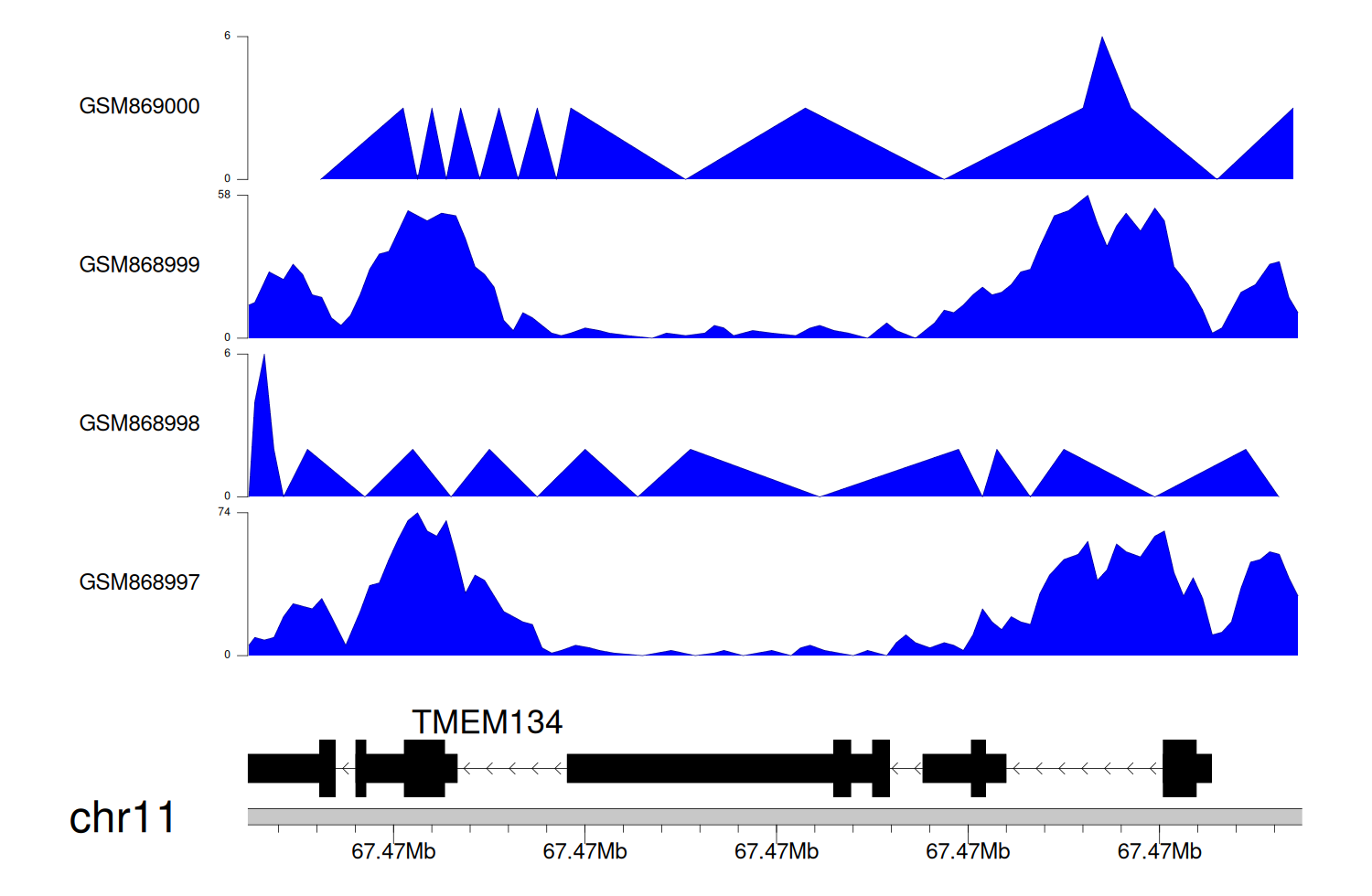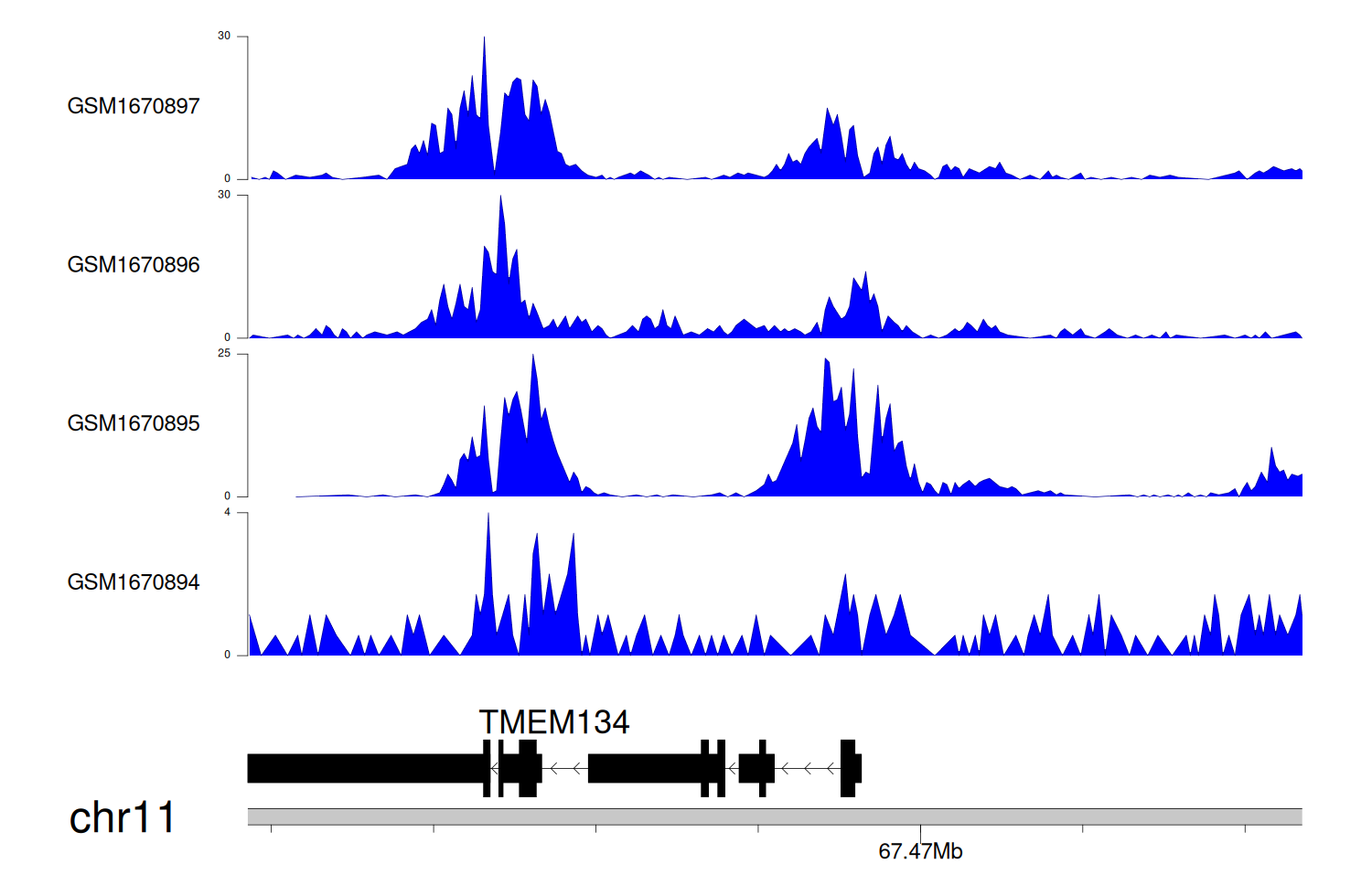 > Dataset: GSE68402 - TMEM134 peak across samples