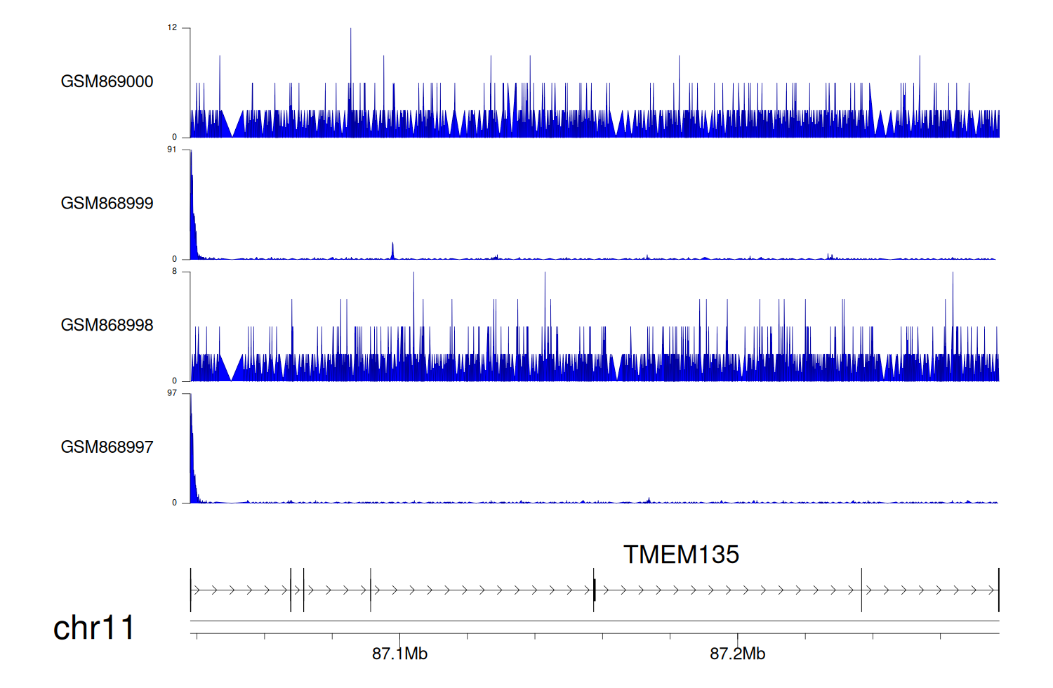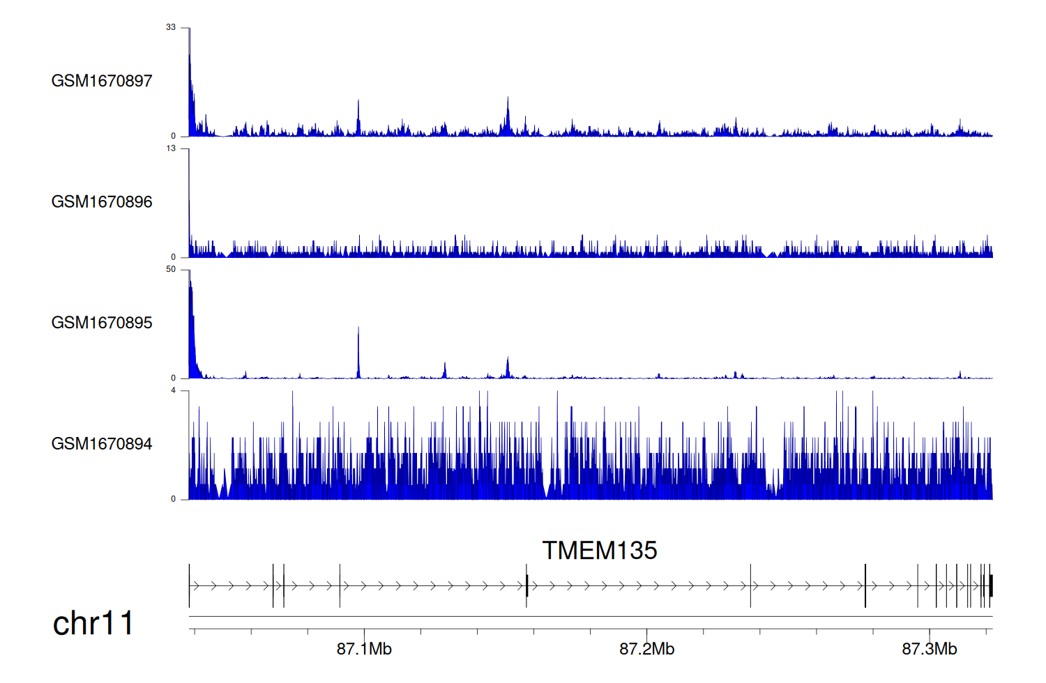 > Dataset: GSE100400 - TMEM135 peak across samples
