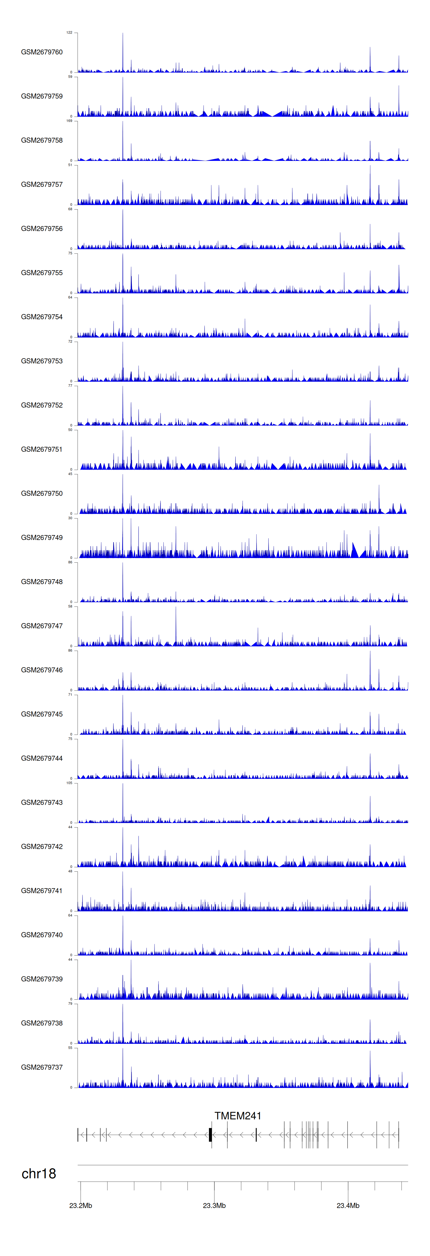 > Dataset: GSE100266 - TMEM241 peak across samples