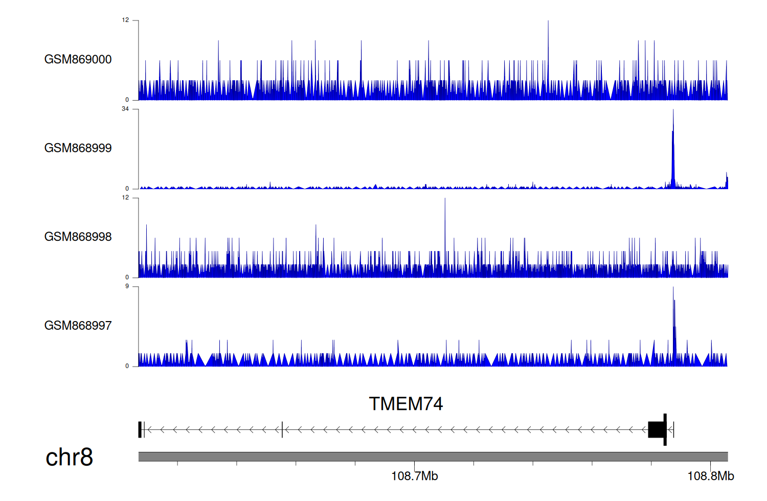 > Dataset: GSE100400 - TMEM74 peak across samples