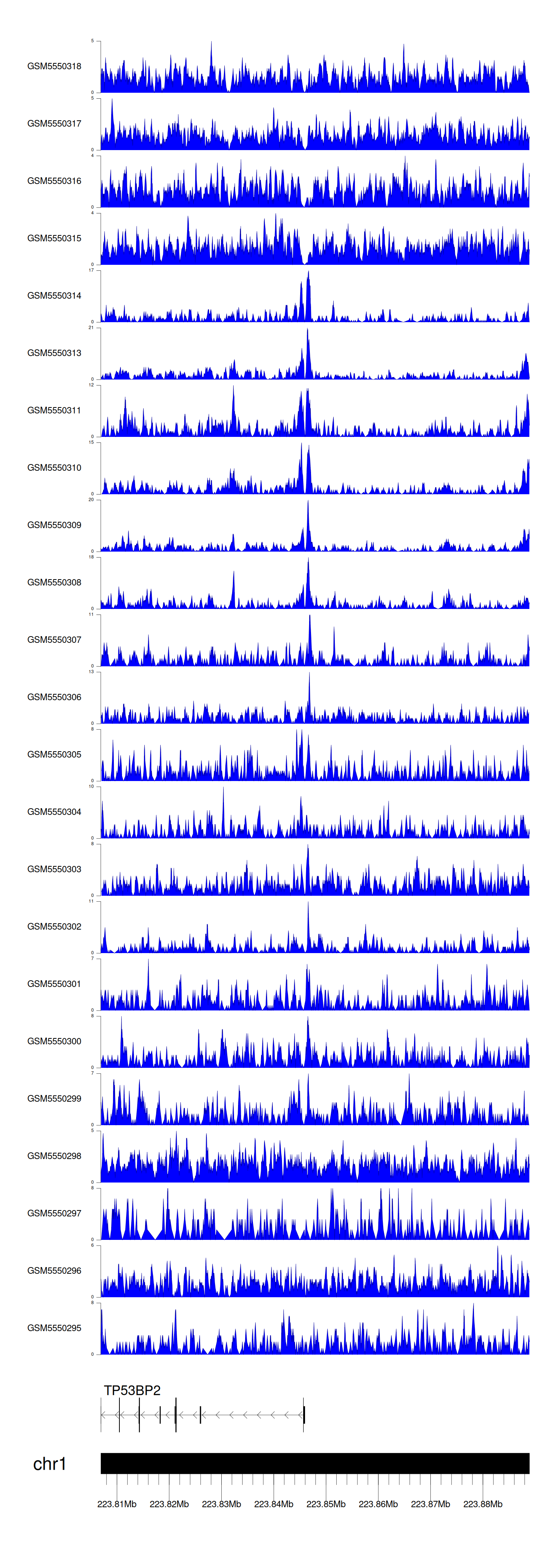 > Dataset: GSE143026 - TP53BP2 peak across samples
