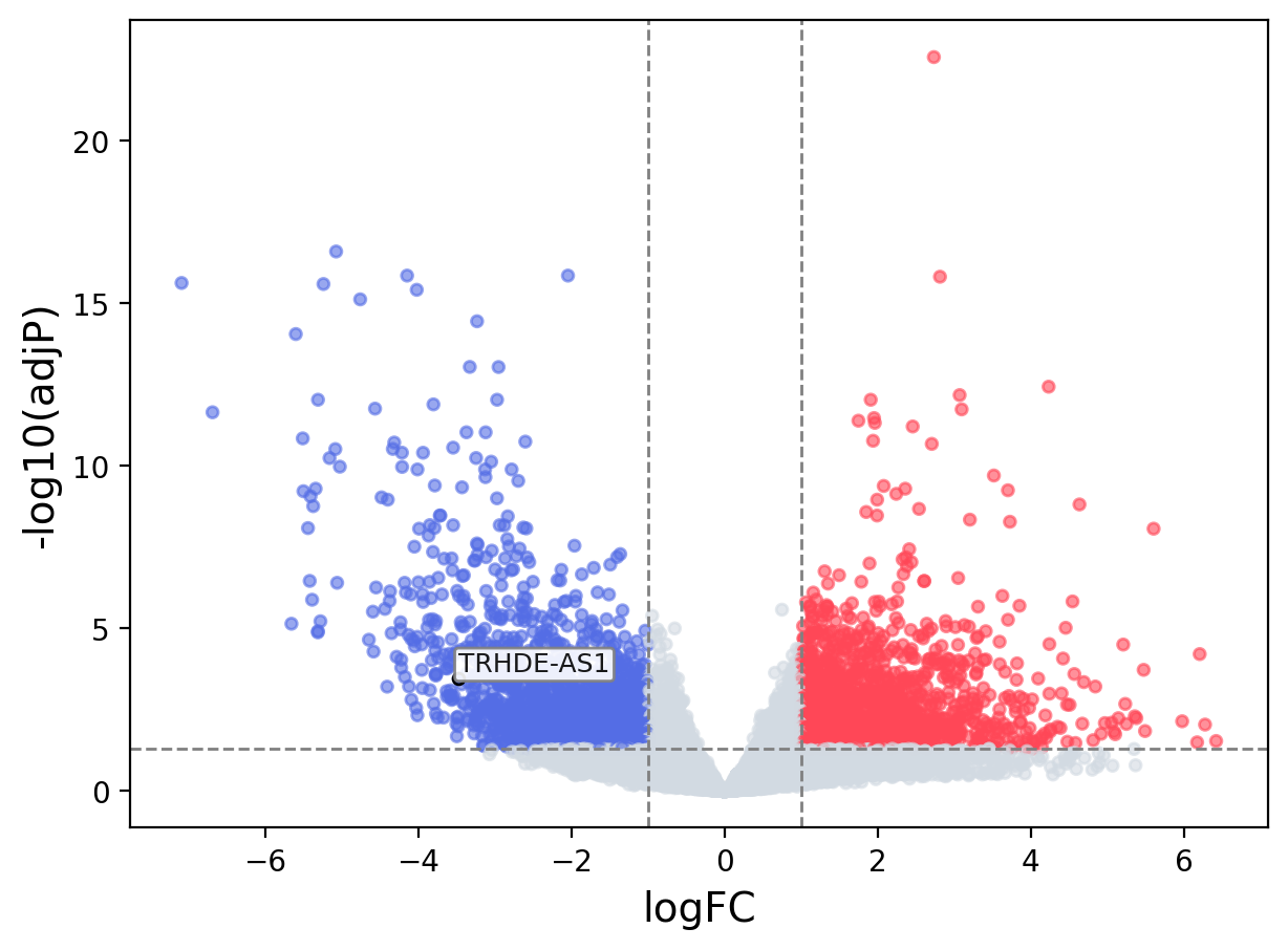 When the query gene is differentially changed in the dataset, a volcano/bar plot will be displayed.