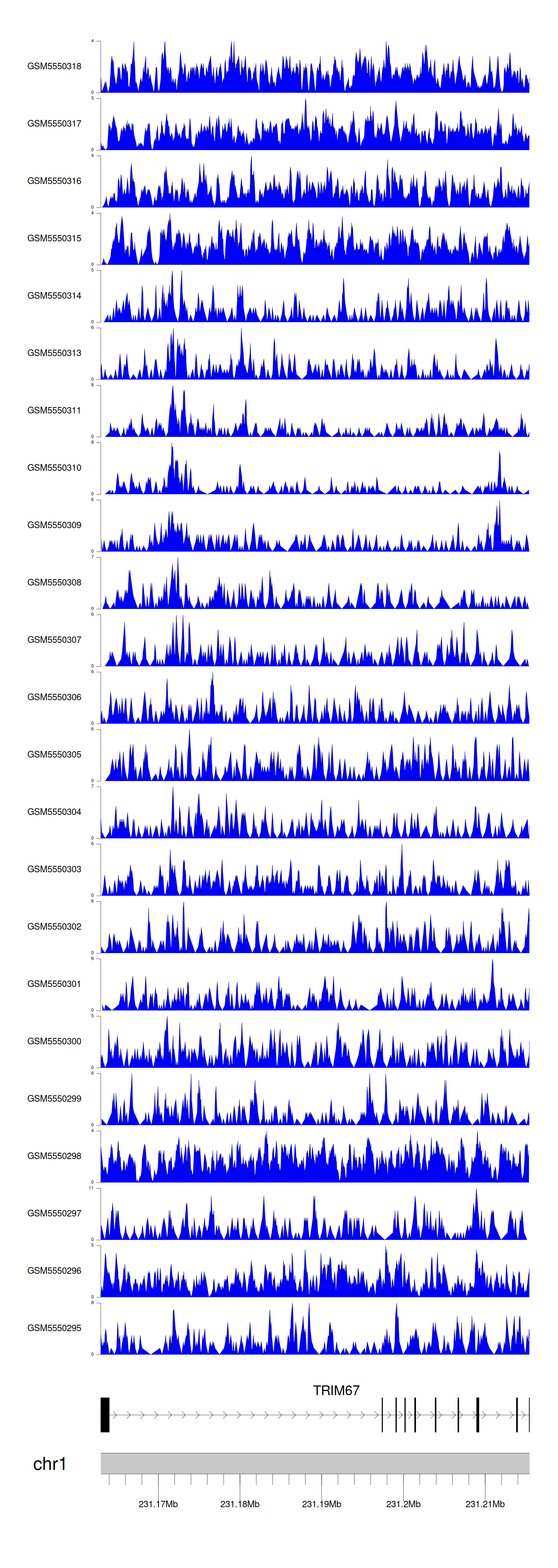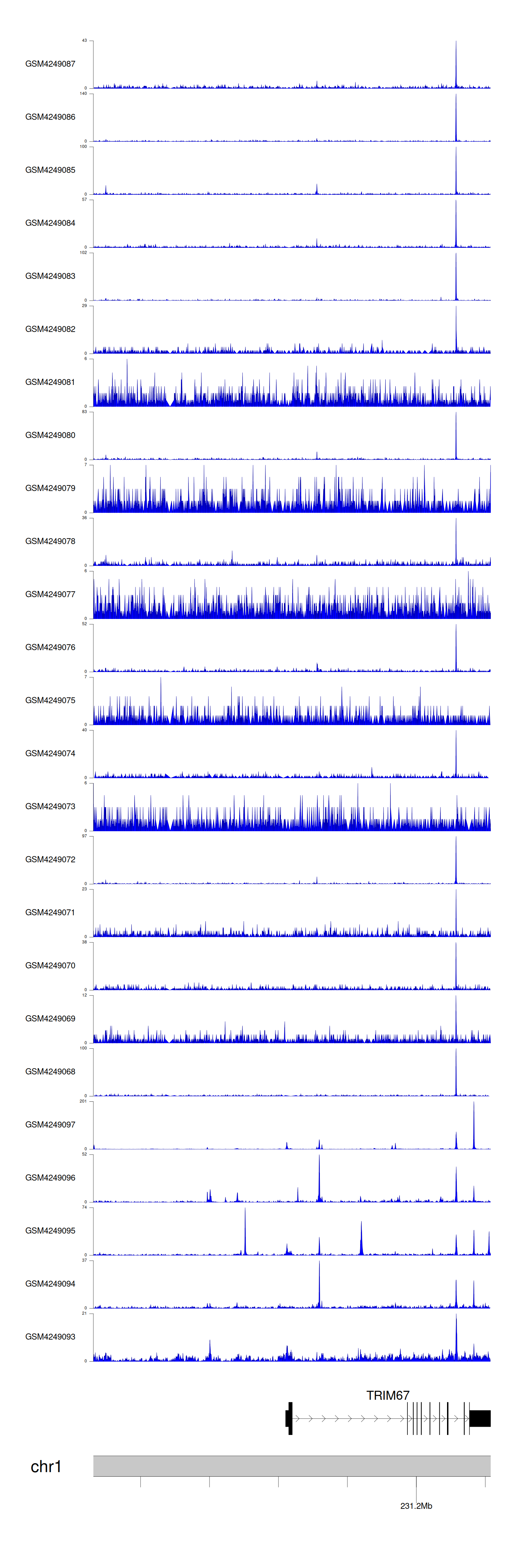 > Dataset: GSE183048 - TRIM67 peak across samples