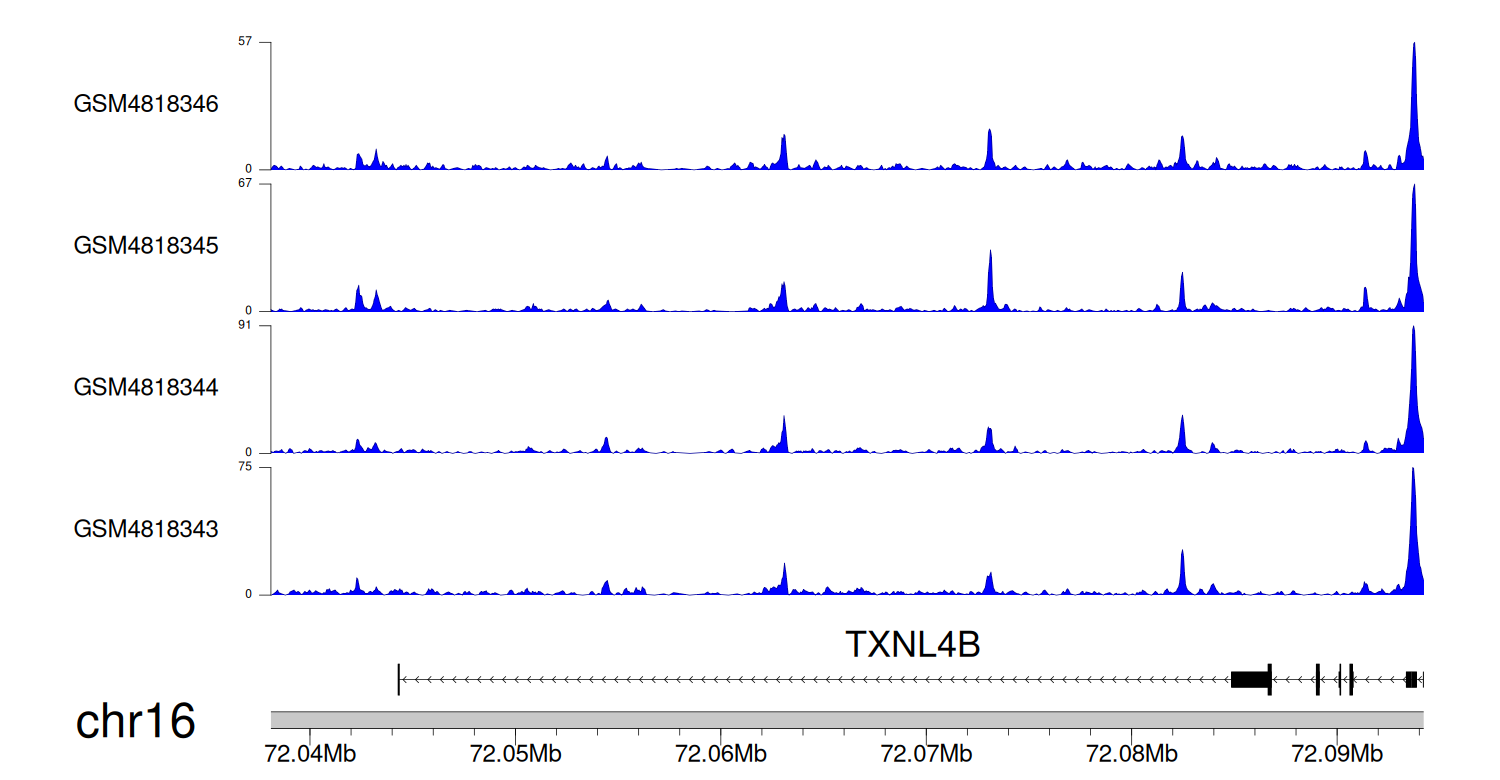> Dataset: GSE131257 - TXNL4B peak across samples