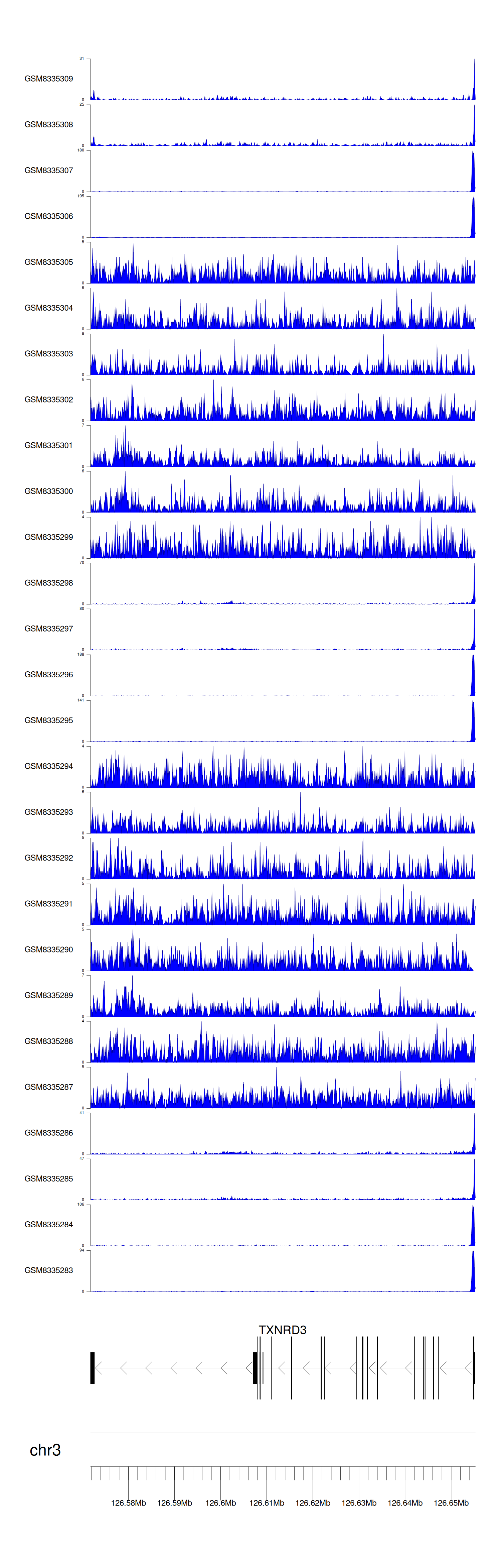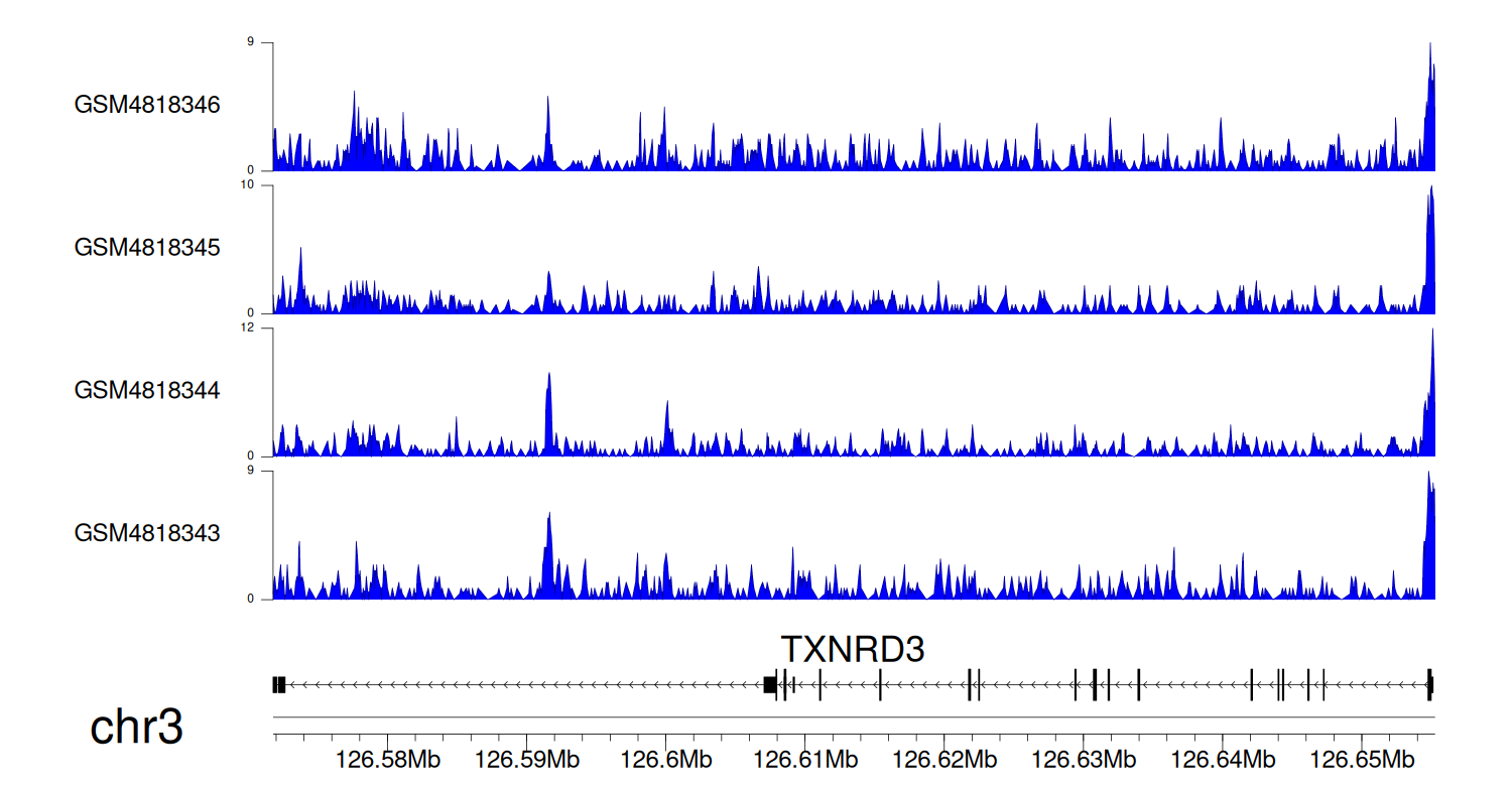 > Dataset: GSE131257 - TXNRD3 peak across samples