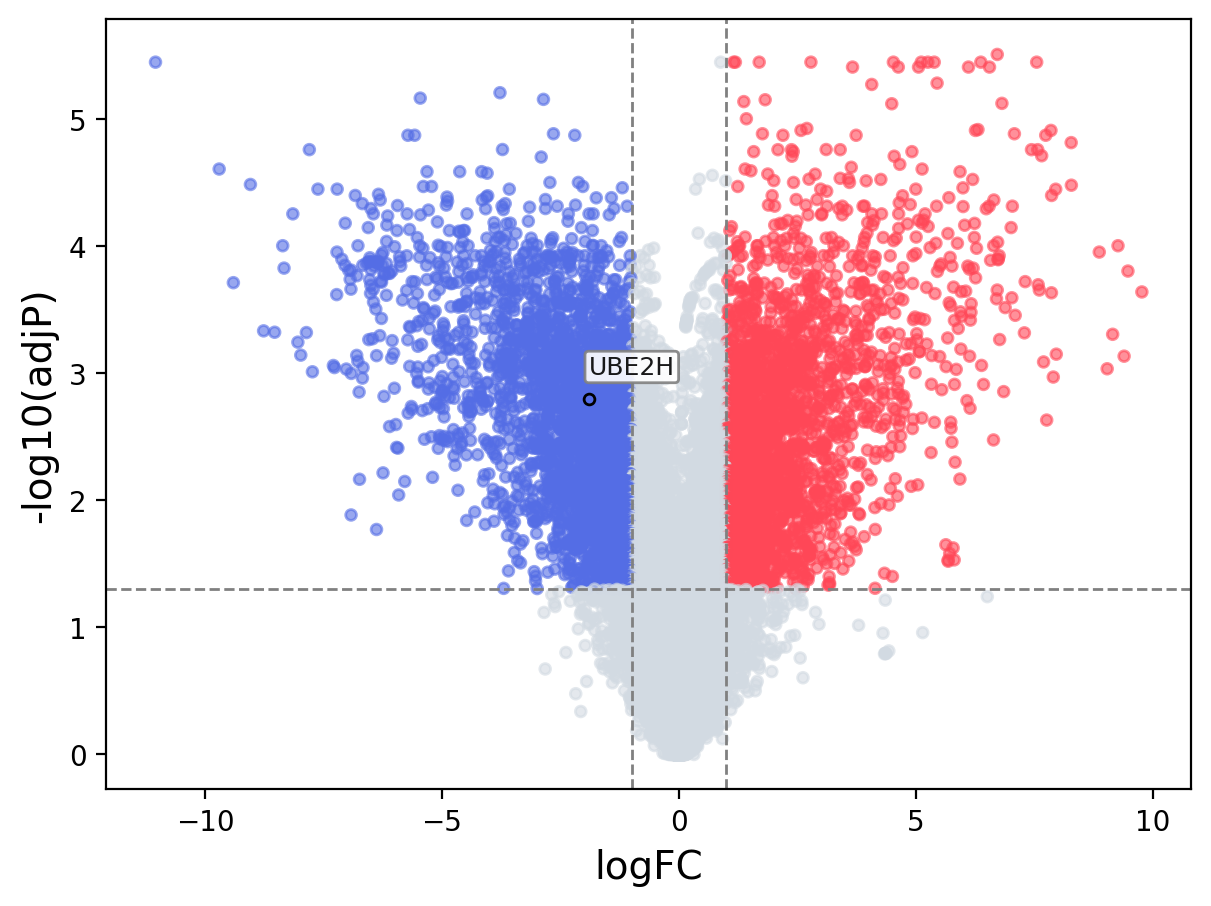 When the query gene is differentially changed in the dataset, a volcano/bar plot will be displayed.