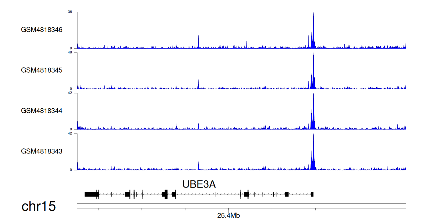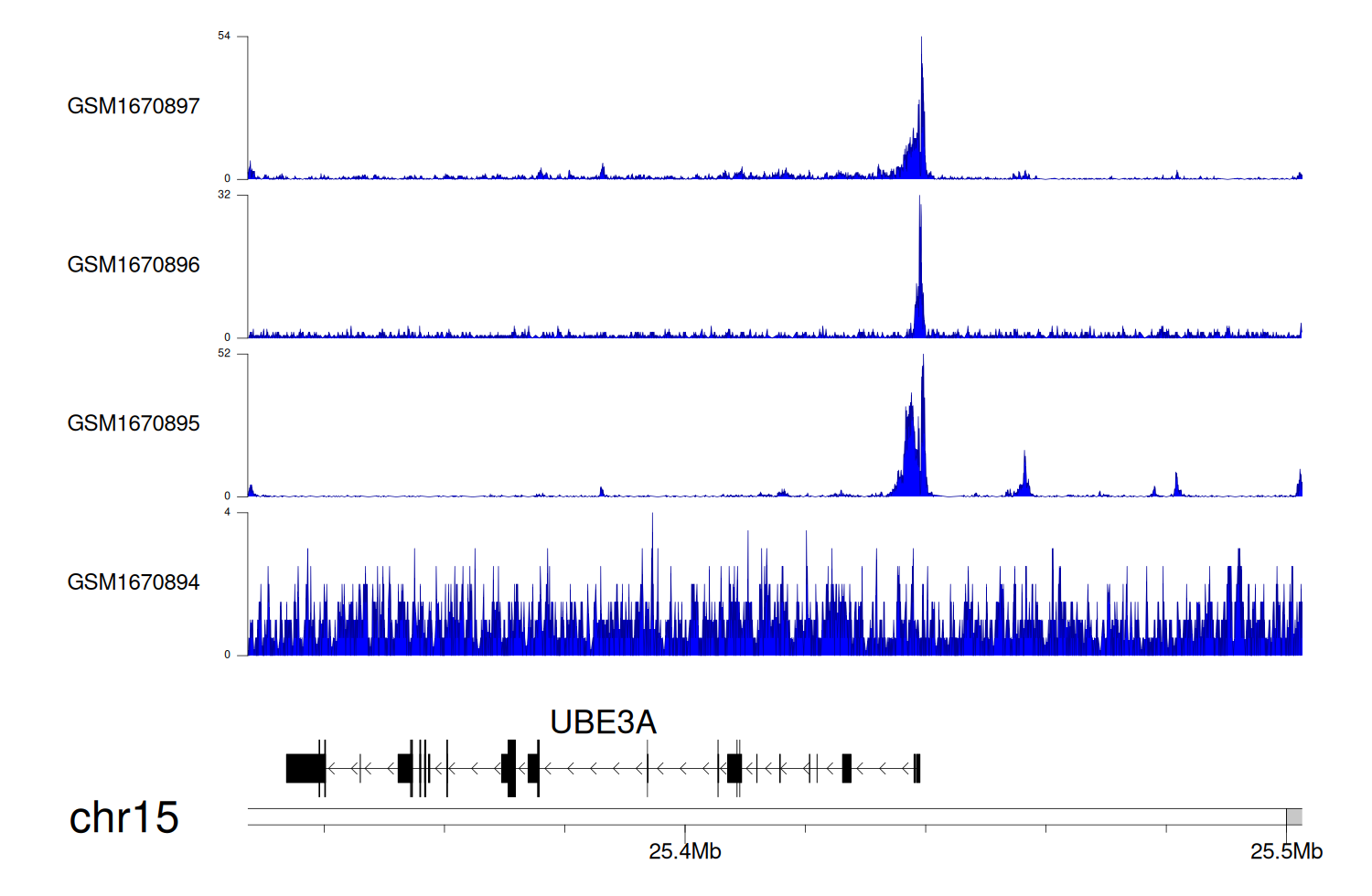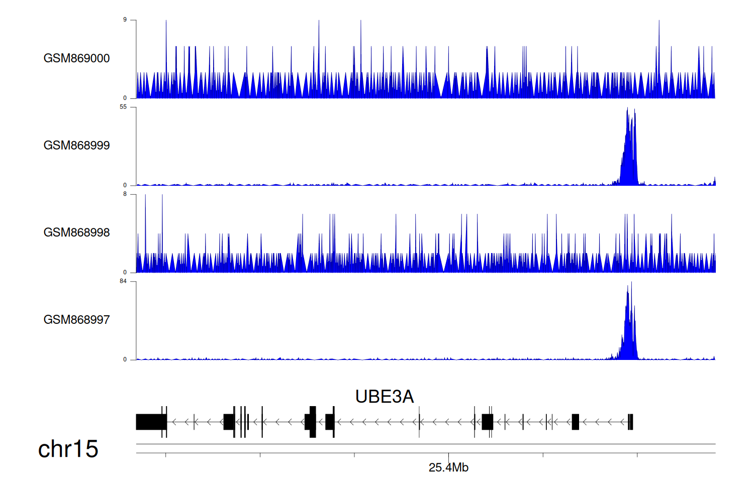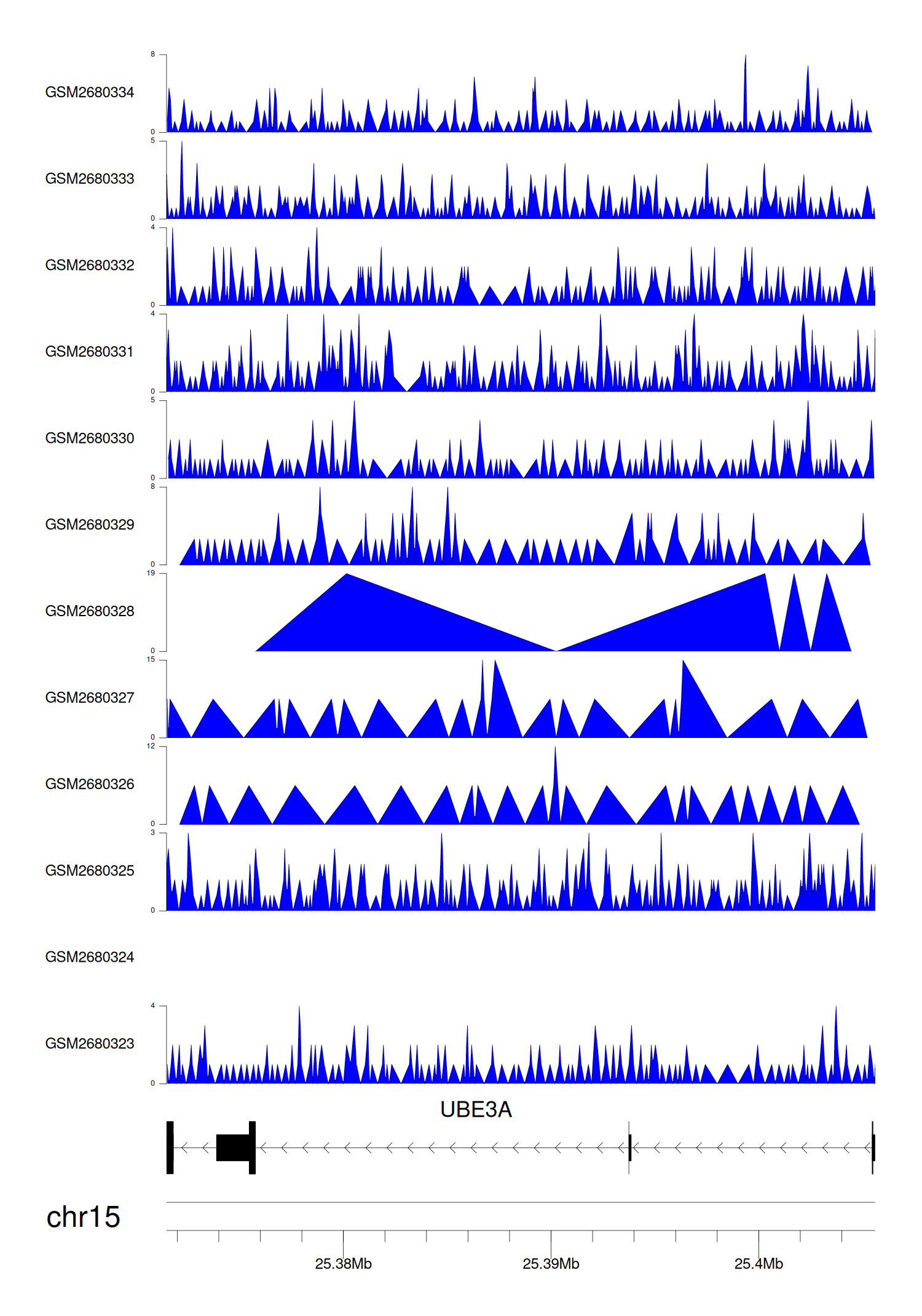 This gene encodes an E3 ubiquitin-protein ligase, part of the ubiquitin protein degradation system. This imprinted gene is maternally expressed in brain and biallelically expressed in other tissues. Maternally inherited deletion of this gene causes Angelman Syndrome, characterized by severe motor and intellectual retardation, ataxia, hypotonia, epilepsy, absence of speech, and characteristic facies. The protein also interacts with the E6 protein of human papillomavirus types 16 and 18, resulting in ubiquitination and proteolysis of tumor protein p53. Alternative splicing of this gene results in three transcript variants encoding three isoforms with different N-termini. Additional transcript variants have been described, but their full length nature has not been determined. [provided by RefSeq, Jul 2008] |