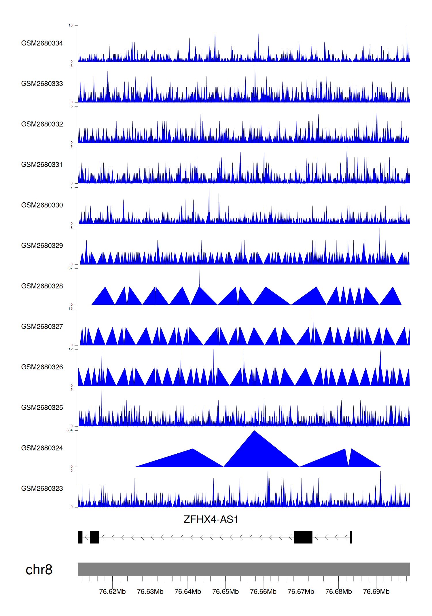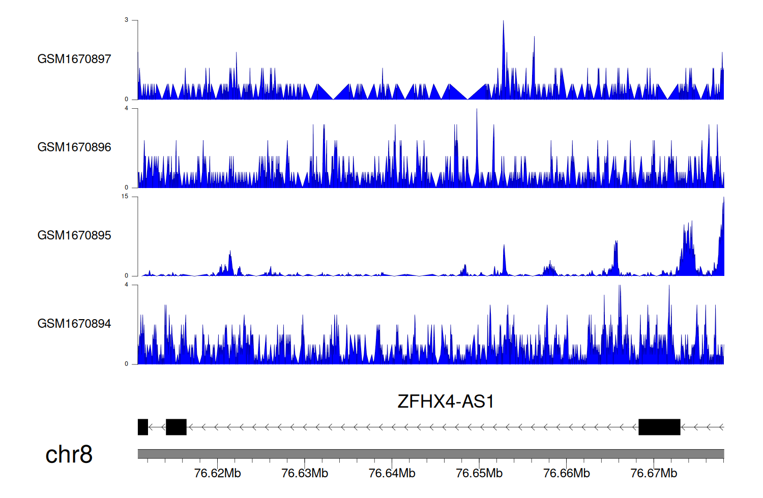 > Dataset: GSE68402 - ZFHX4-AS1 peak across samples