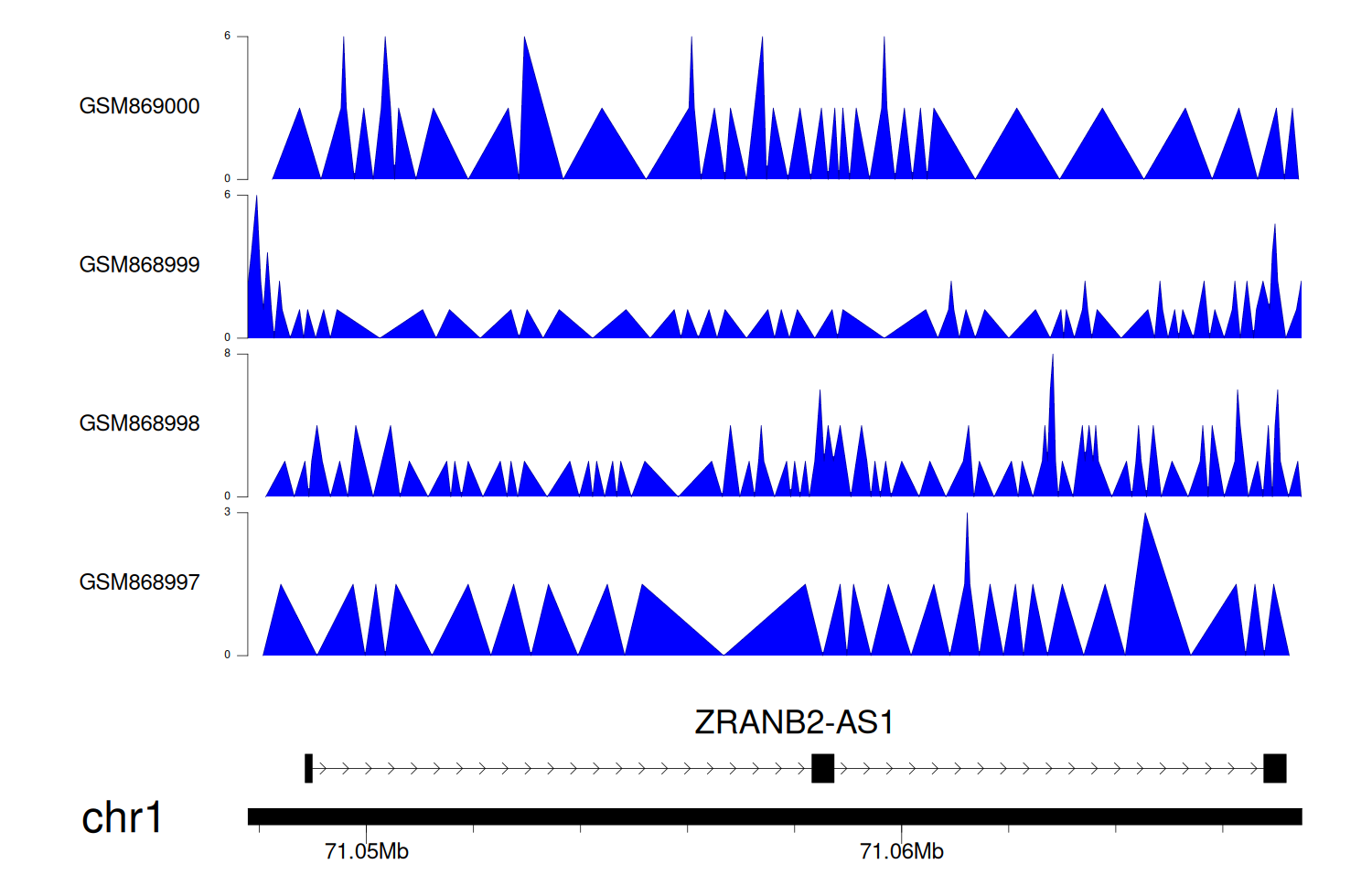 > Dataset: GSE68402 - ZRANB2-AS1 peak across samples